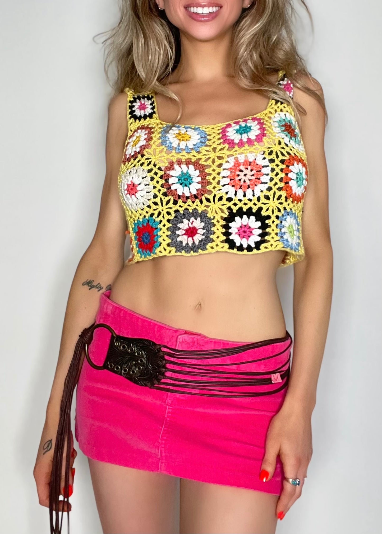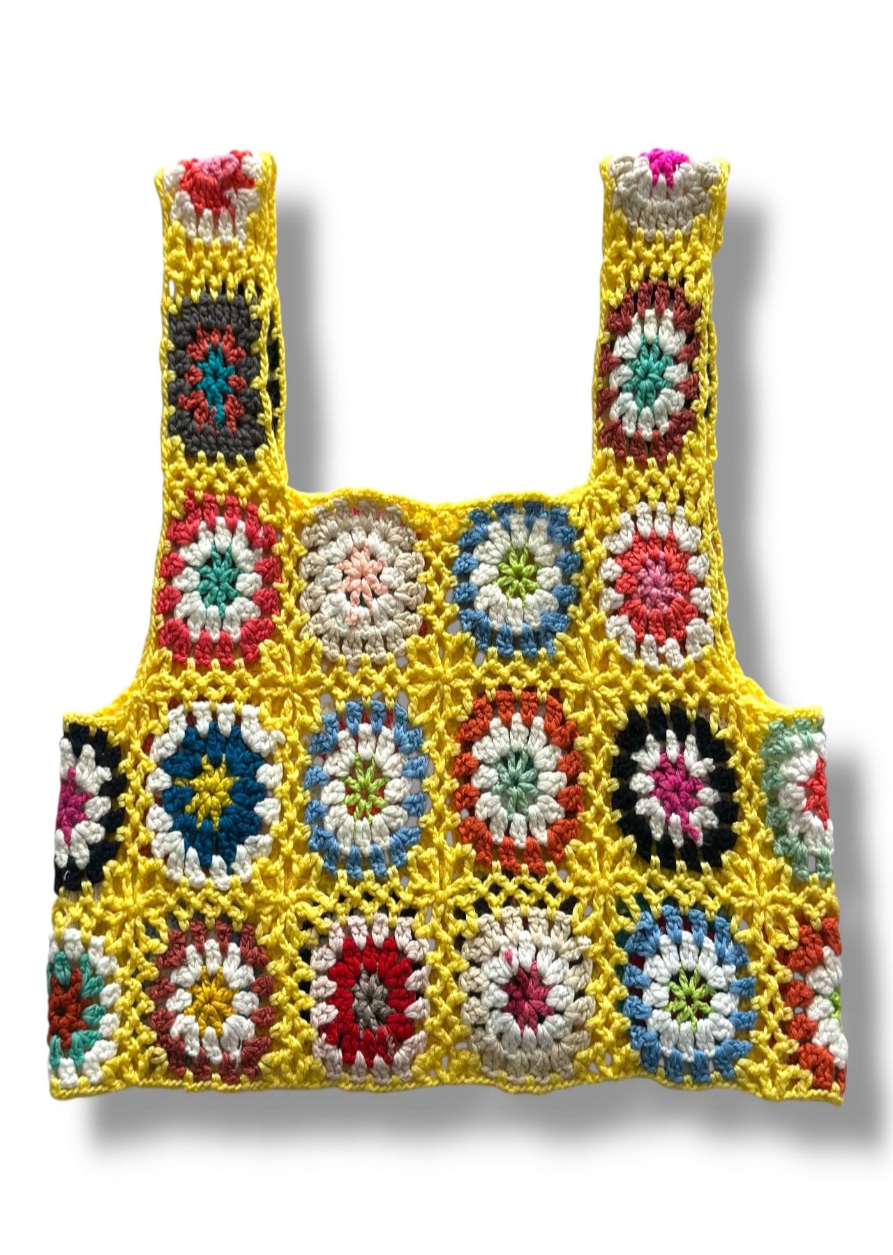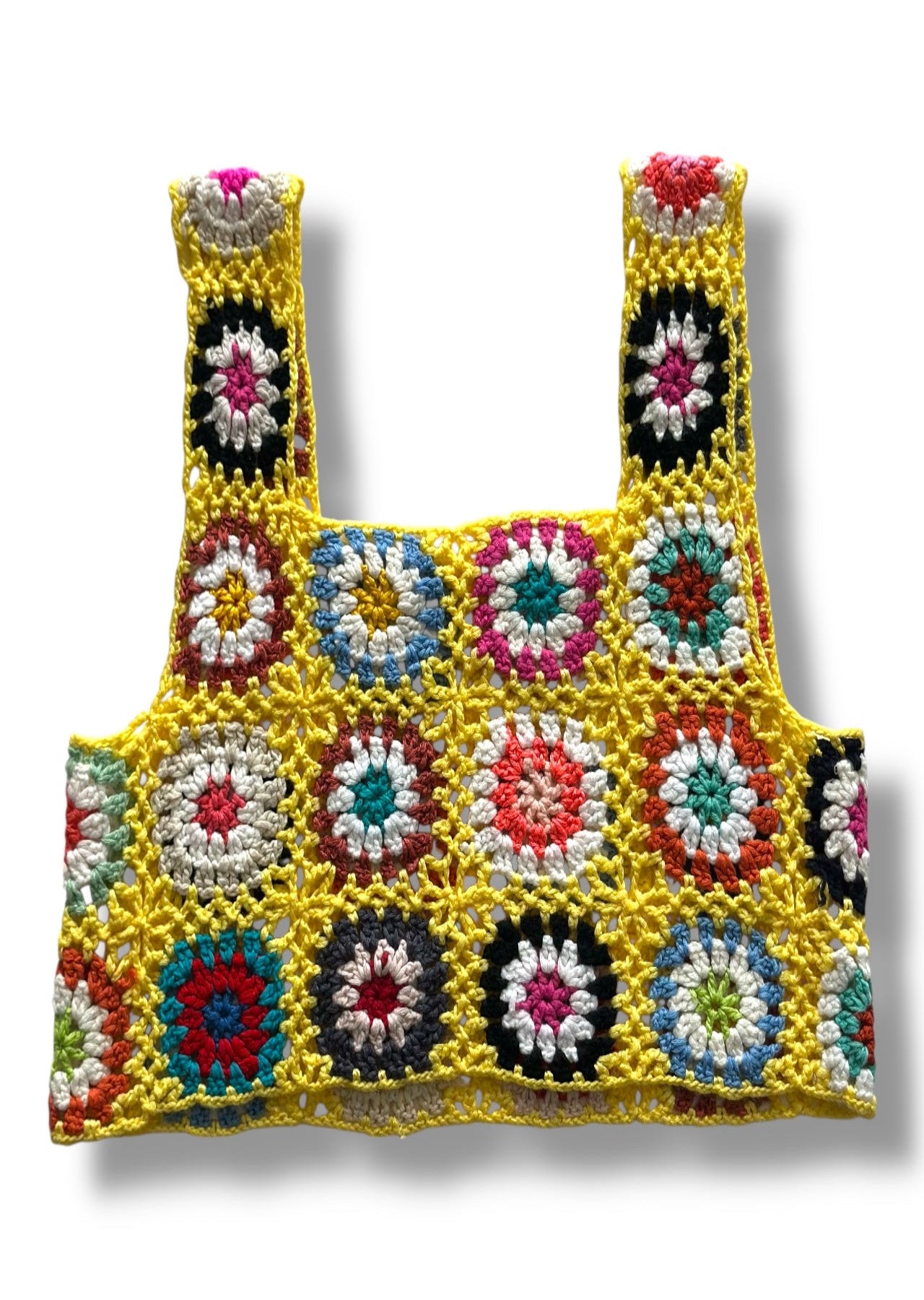 70s Handmade Crochet Granny Square Crop Top – Vintage Sheer Boho Cami (M)