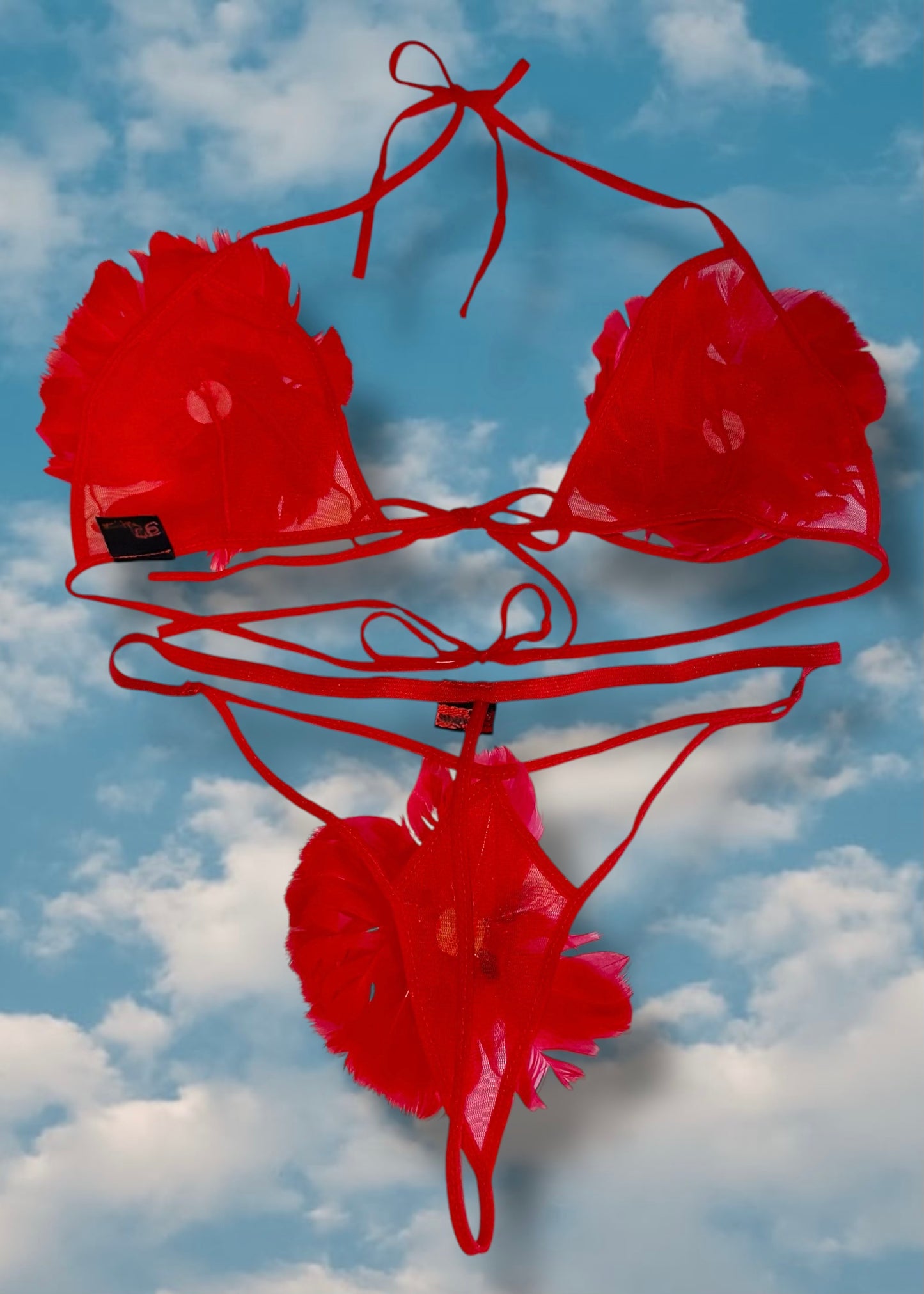 90s Red Feathered Mesh Lingerie Bra-Panty Set, Sheer Valentines Gift