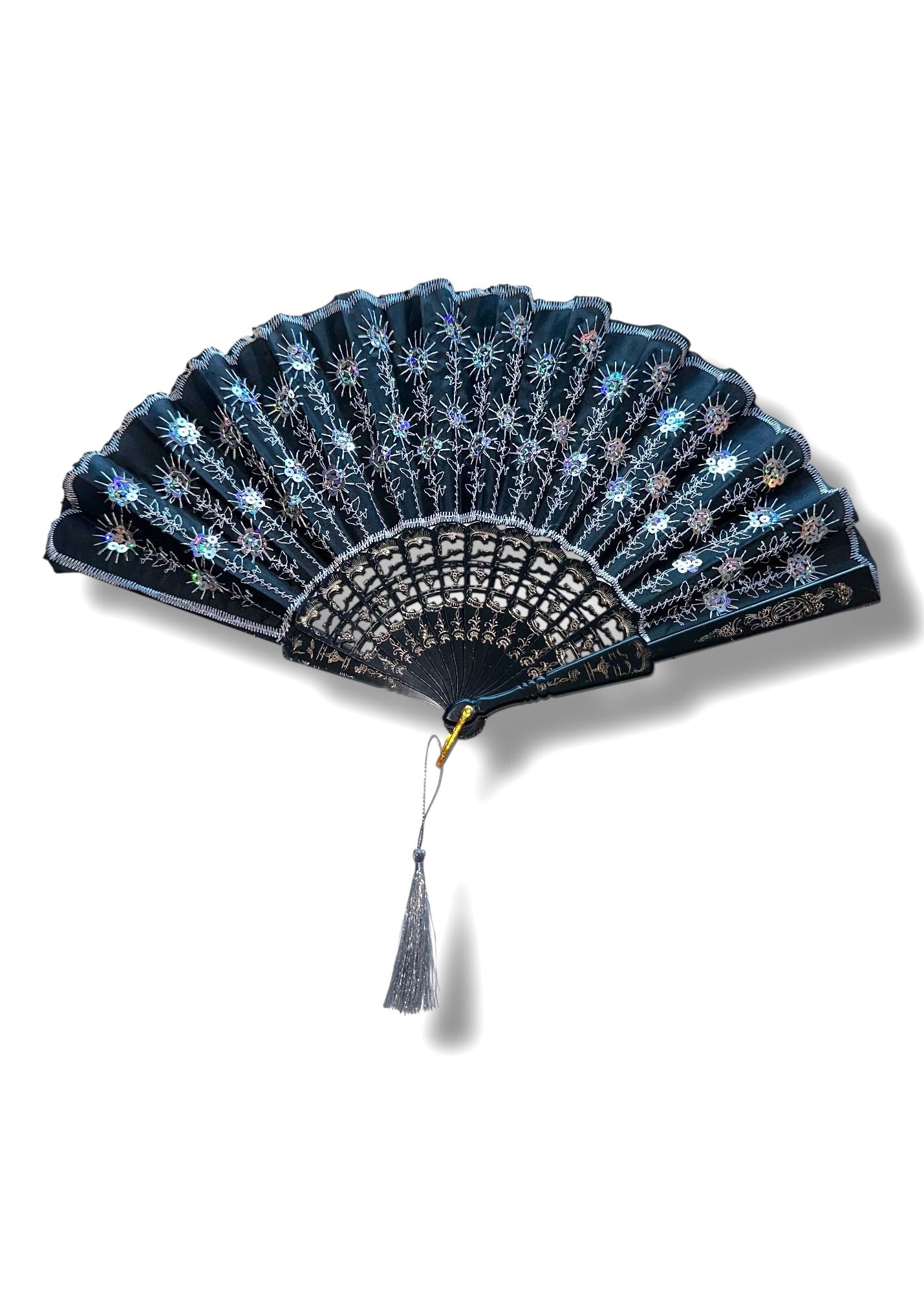 Each fan is crafted from high-quality vintage deadstock materials, featuring ornate lacework, shimmering sequins, and tassel accents at the latch closure. Perfect for pairing with corsets, burlesque ensembles, or festival outfits — these fans are made to flirt, tease, and captivate under the lights.