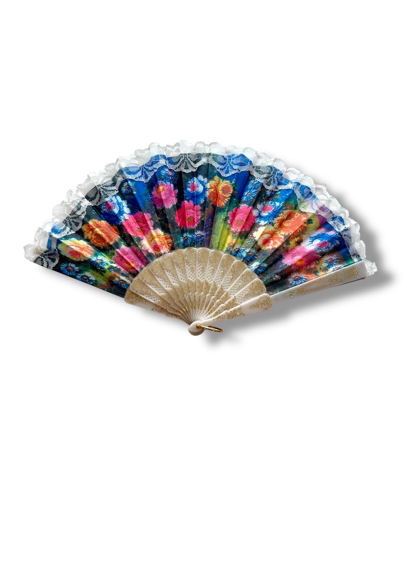 🌈 Blue Rainbow Floral: Vibrant floral print with soft white lace trim — colorful and classic.