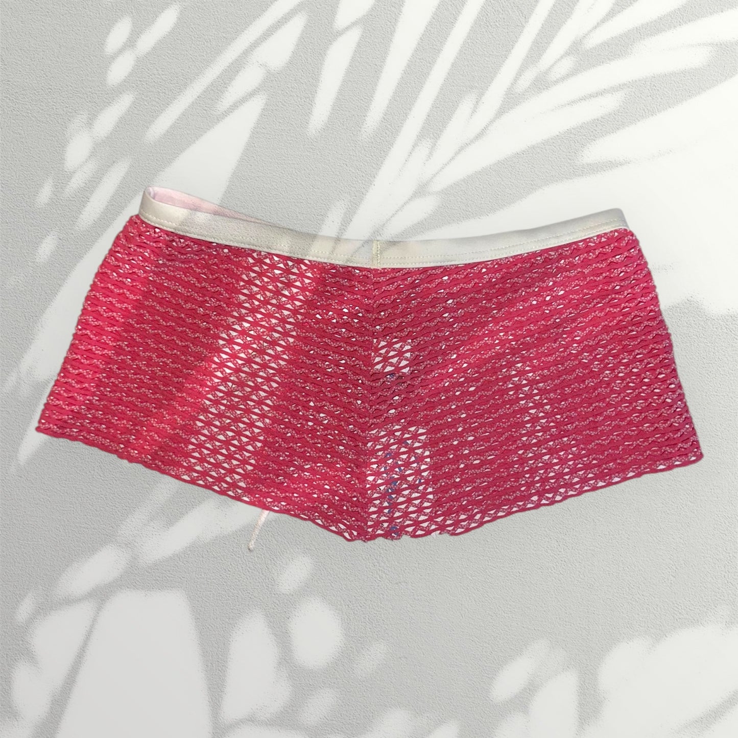 The sweetest, bright pink / white crochet, sheer mini skirt with white, stretchy waistband trim and matching white slit at side thigh/hip featuring adjustable corset-like tie closure. Mid rise, mini skirt fit. Authentic early 2000’s deadstock vintage bikini cover up - The most beautiful and flattering piece! in deadstock vintage condition. In unworn vintage condition. MADE IN U.S.A.