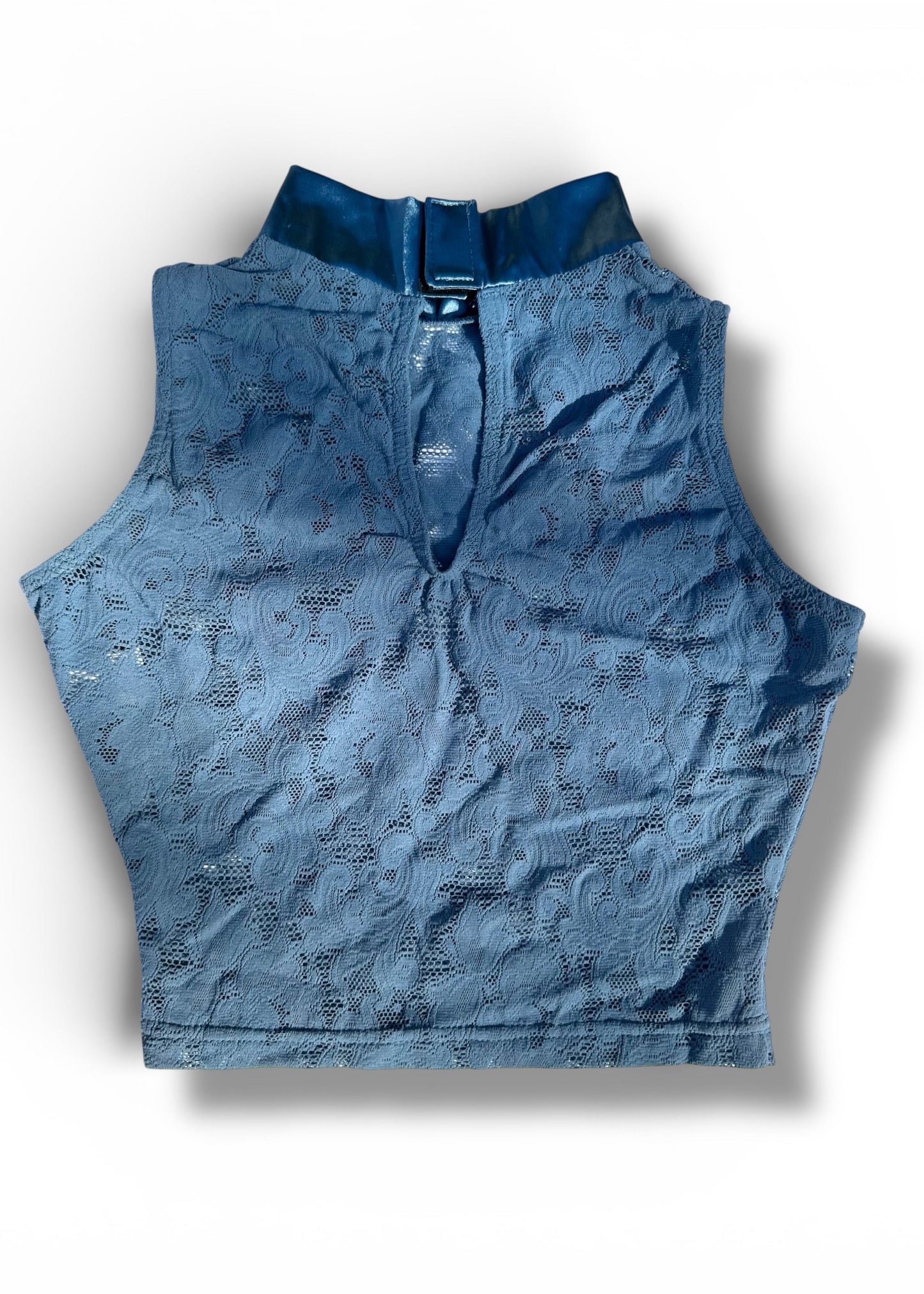 The figure-flattering cut clings in all the right places, featuring a high mock-neck silhouette, delicate crochet lace texture, and a subtle back keyhole detail with adjustable velcro neck closure for the perfect fit. Wear it layered over lingerie, bralettes, or under denim and leather for that dreamy Y2K editorial vibe.