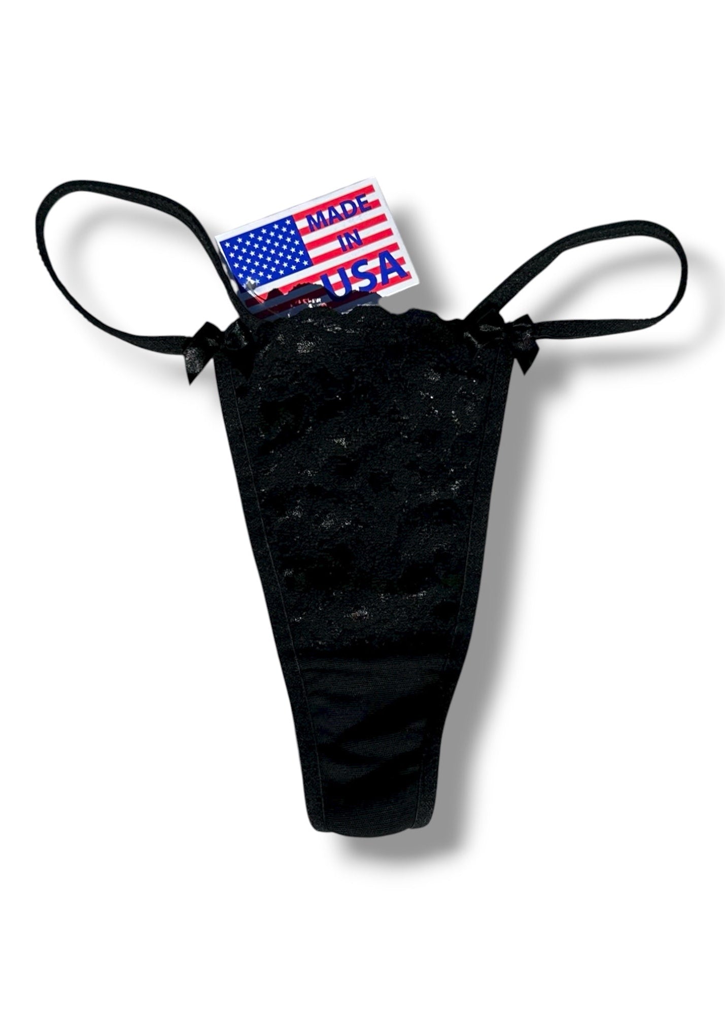 Made from stretchy, sheer black lace with intricate floral patterning, this ultra-soft, high-quality panty features delicate ribbon accents at the front corners and thin, flexible straps that lay flat for a seamless look. The low-to-mid rise V-cut lengthens the legs and sculpts your silhouette for that sultry, classic Y2K shape.