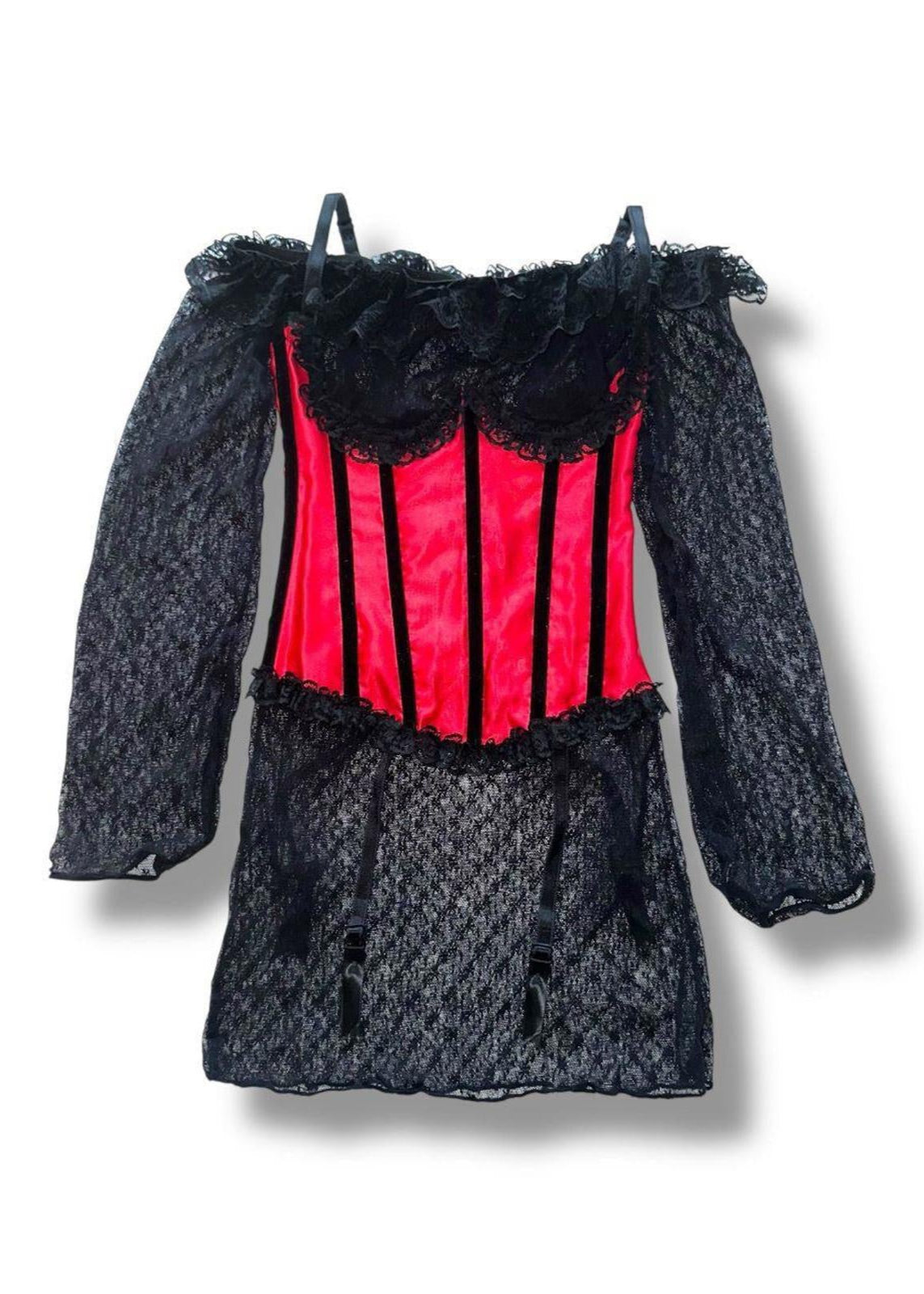 Step into vintage allure with this authentic 90s Saloon-Costume Dirndl 2-Piece Set. Includes a sheer black lace puff-sleeve slip mini dress and a red & black satin dirndl corset with heavy-duty boning, adjustable straps, and secure hook closure. Perfect for cosplay, Halloween, stagewear, or themed events.