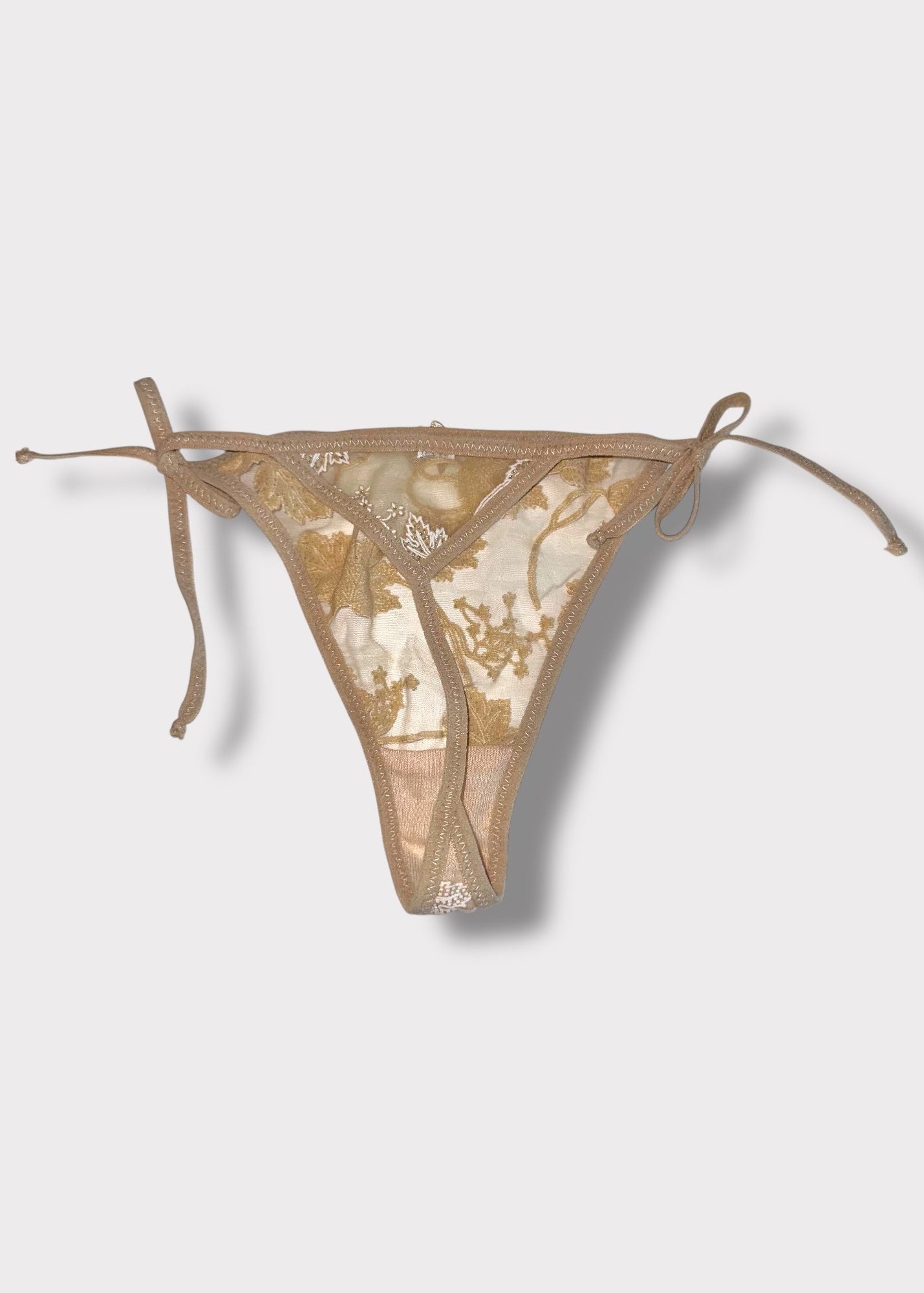 Crafted from a super-sheer floral mesh with a delicate shimmer overlay, this thong features dainty adjustable side ties for the perfect fit and a soft cotton-spandex blend for lasting comfort. Finished with a tiny satin bow at the center, it’s the definition of coquette meets vintage glamour.