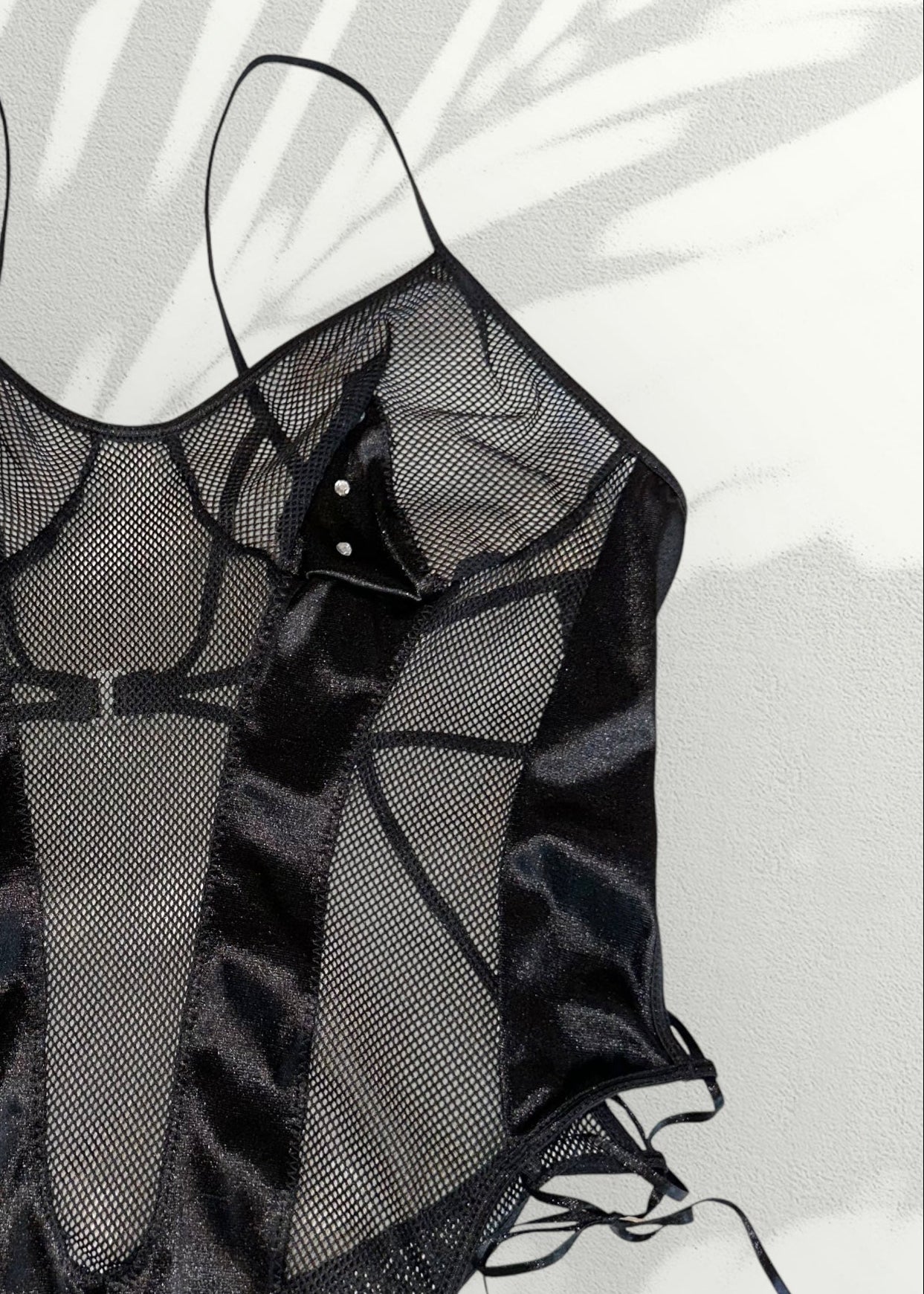 Turn up the heat with this stunning Y2K backless bodysuit, a bold and glamorous statement piece. Crafted from stretchy satin and sheer fishnet panels, it’s designed to flatter your curves while exuding confidence and allure.