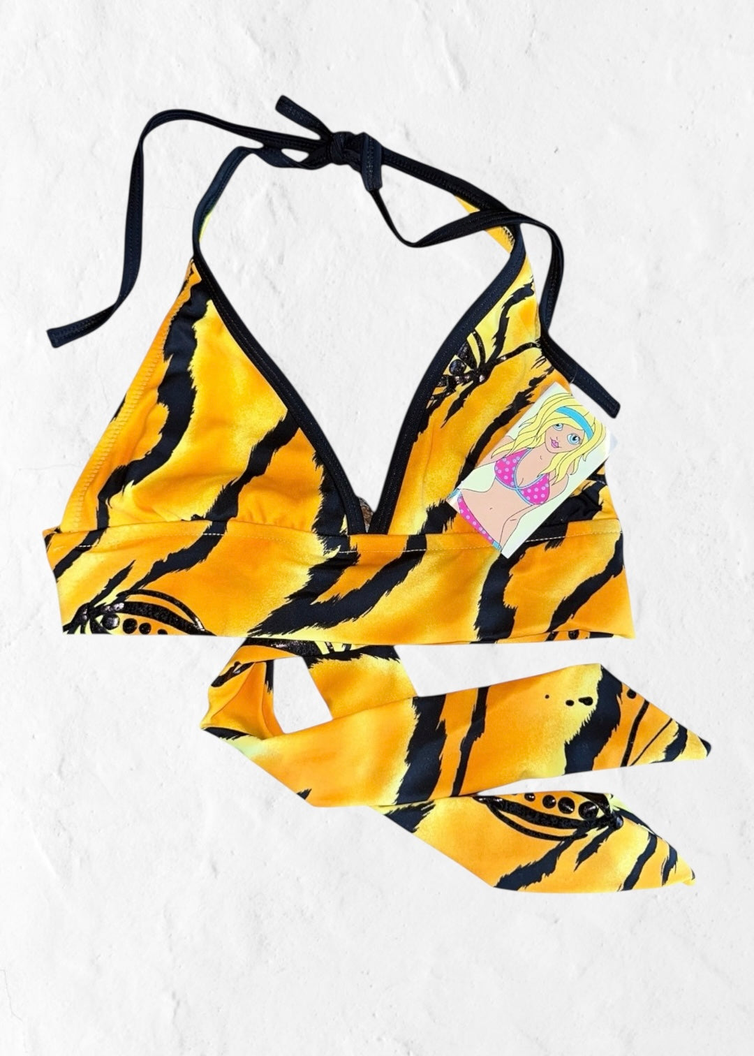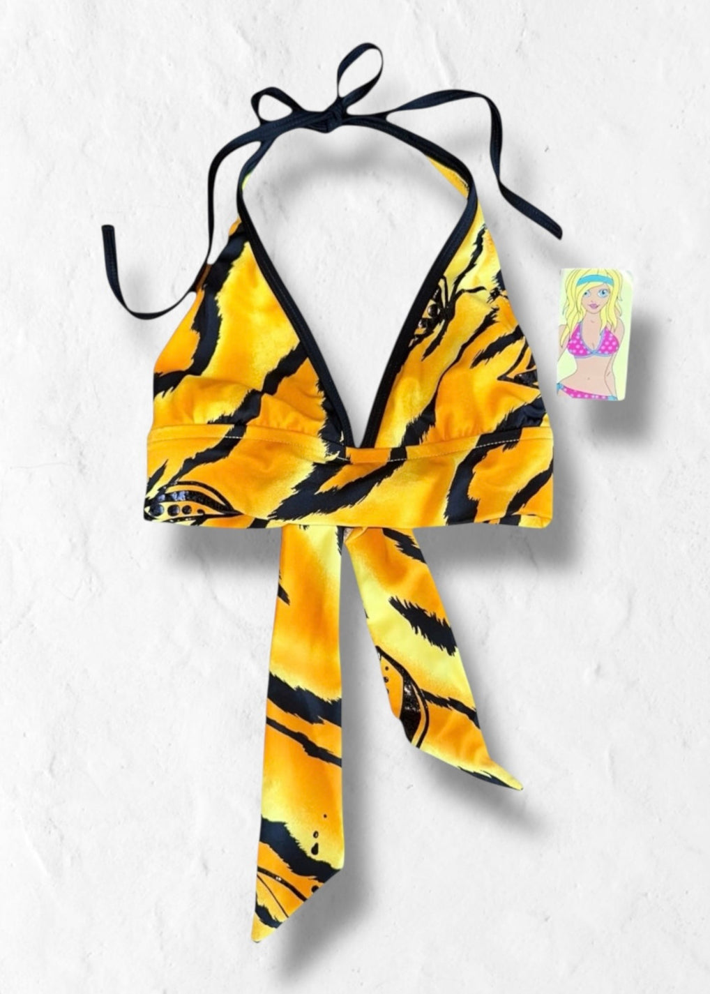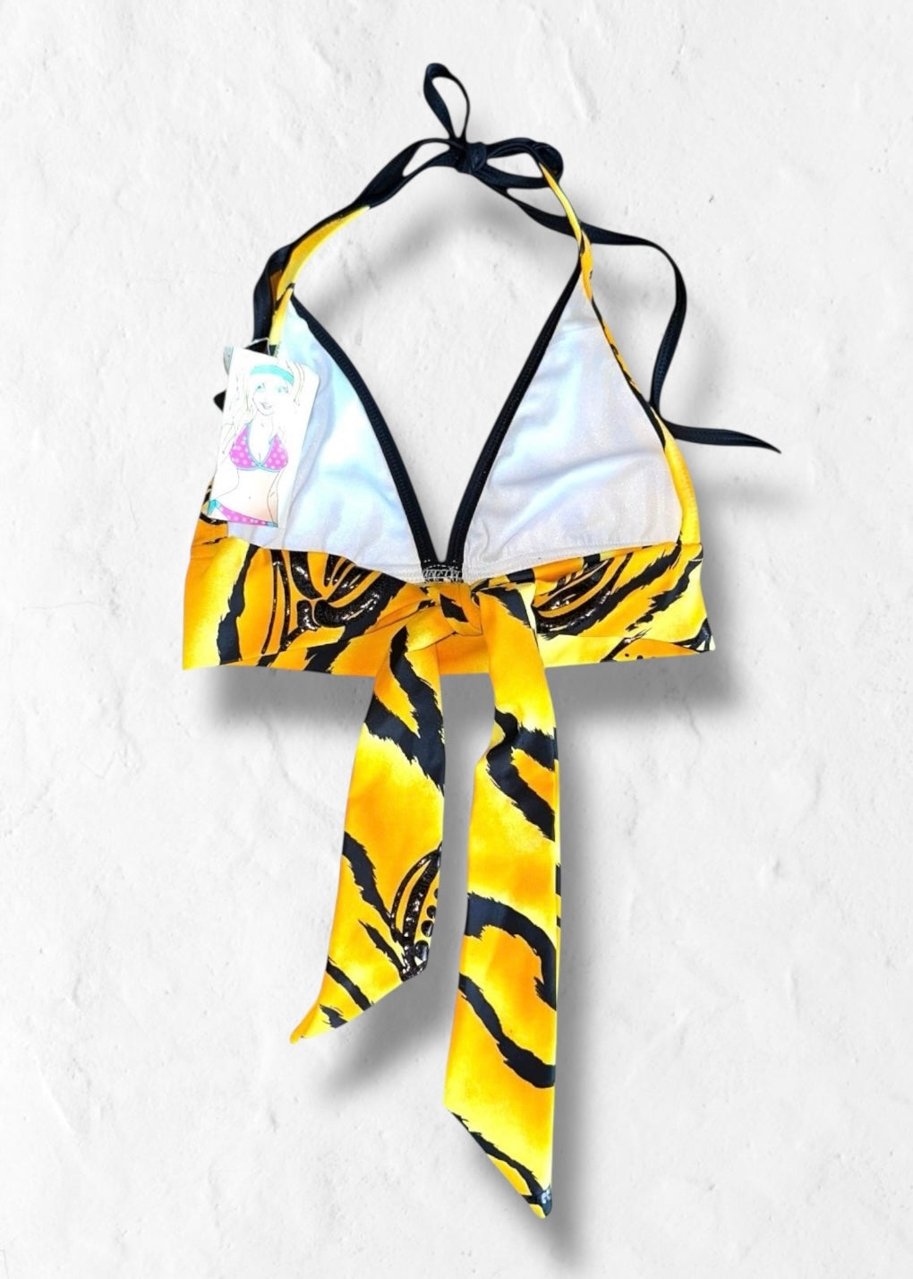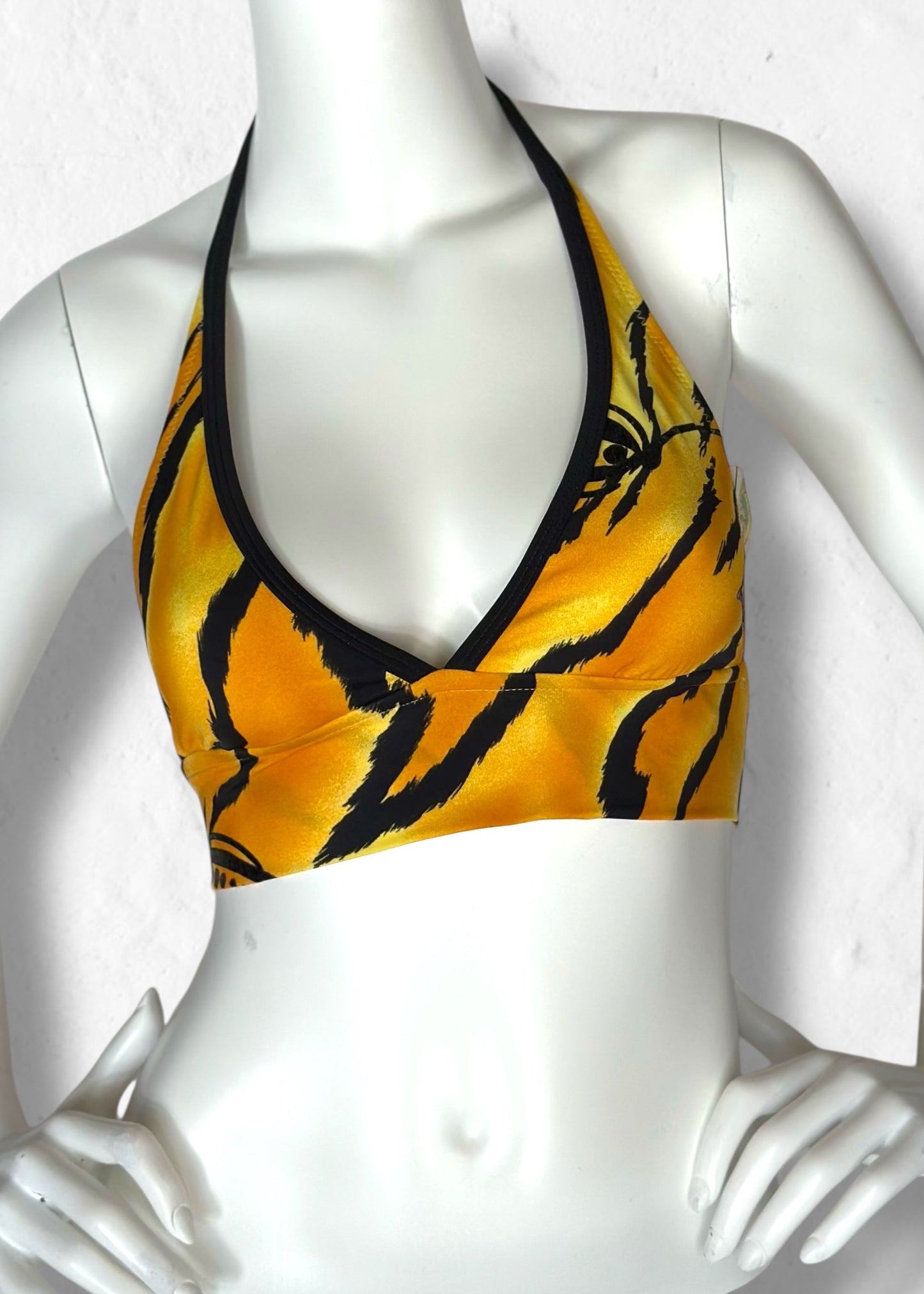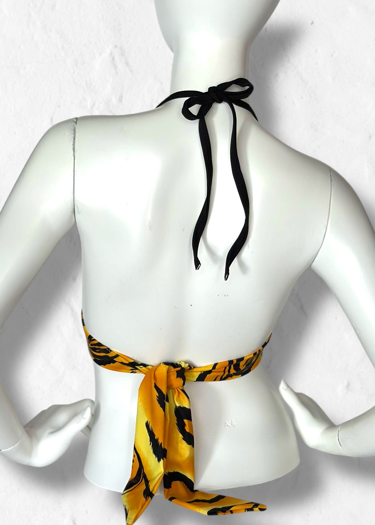 Unleash your wild side in this rare 1990s animal print plunge halter bikini top — an authentic deadstock vintage gem that blends retro seduction with timeless boho glam. Handmade in the U.S.A. with ultra-stretchy nylon/spandex fabric, this sultry top features a deep plunge neckline, flattering thick sash-style neck ties, and a minimalist back strap for a barely-there look that still offers confident support.