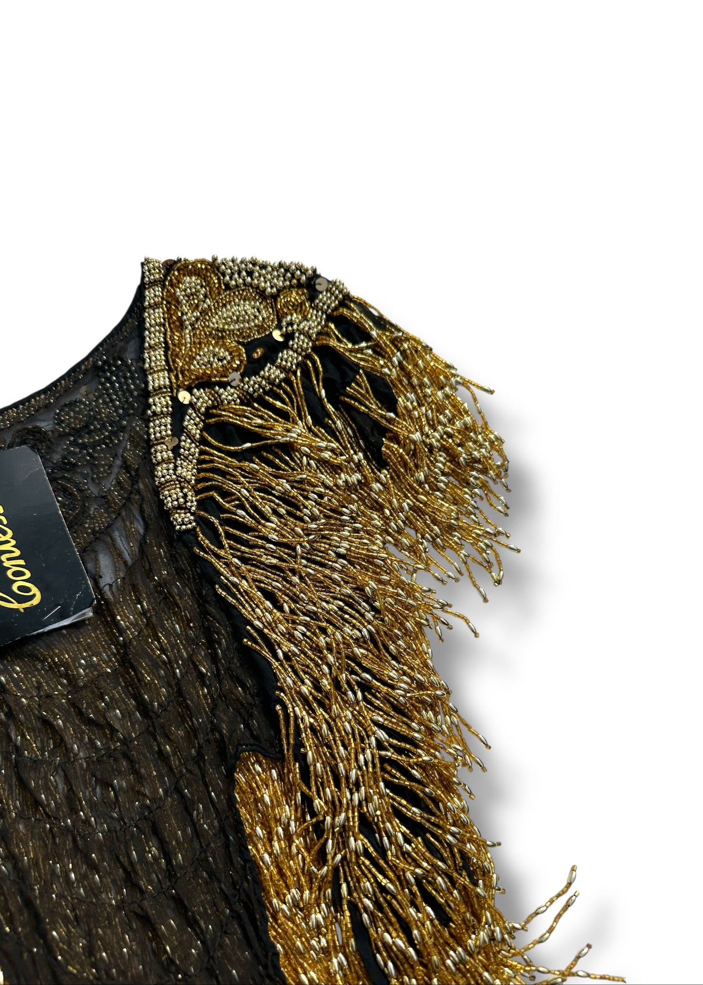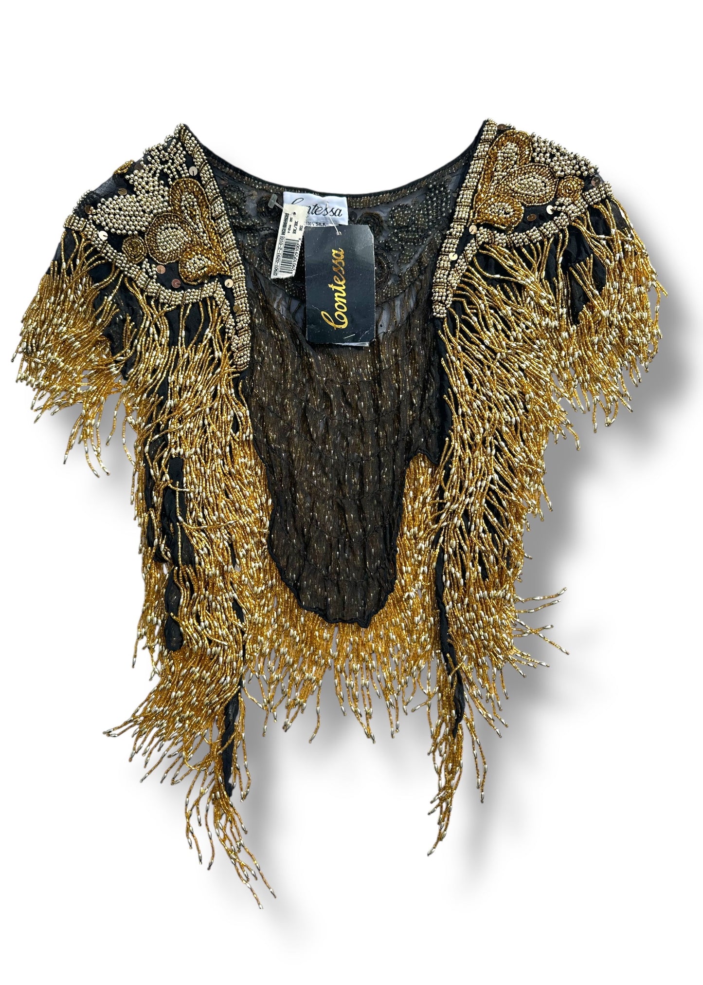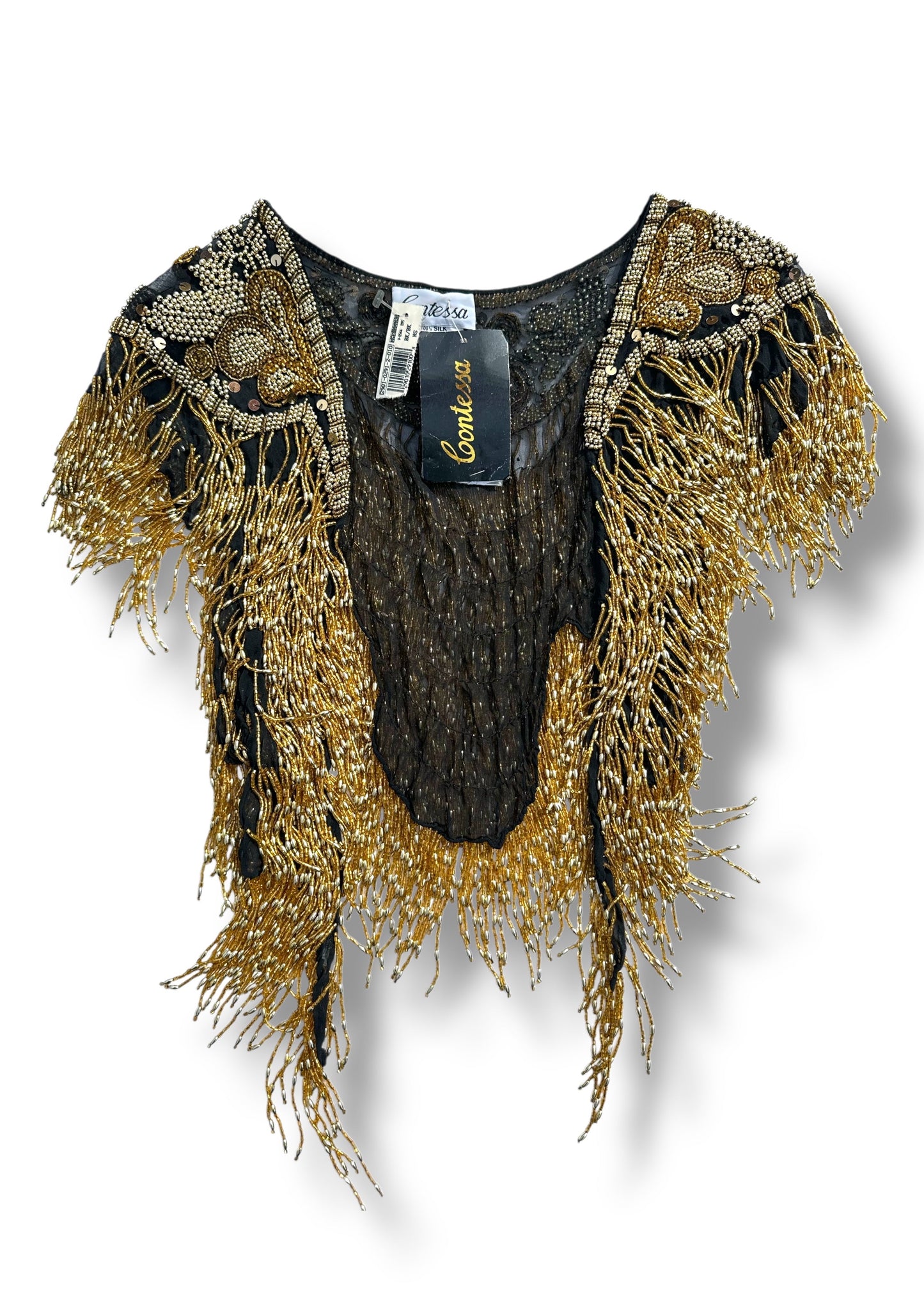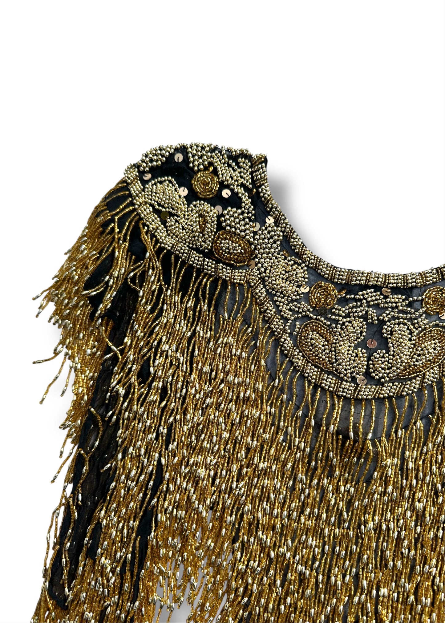 This rare antique deadstock piece features intricate hand-applied gold and black beadwork over a 100% silk base, finished with dramatic cascading fringe measuring up to 16 inches in length.