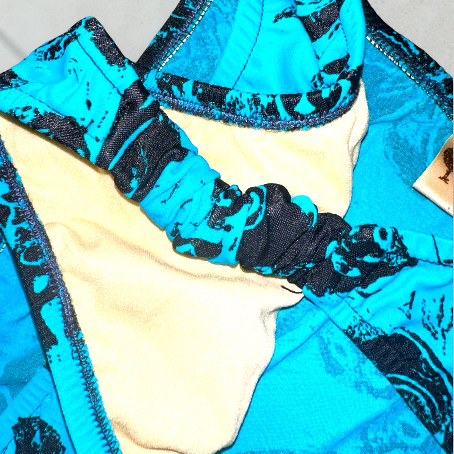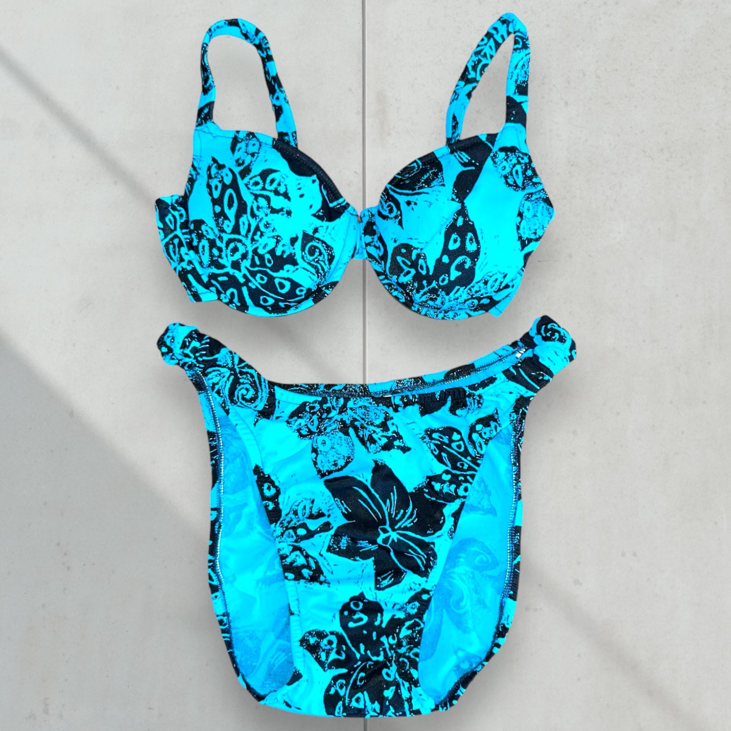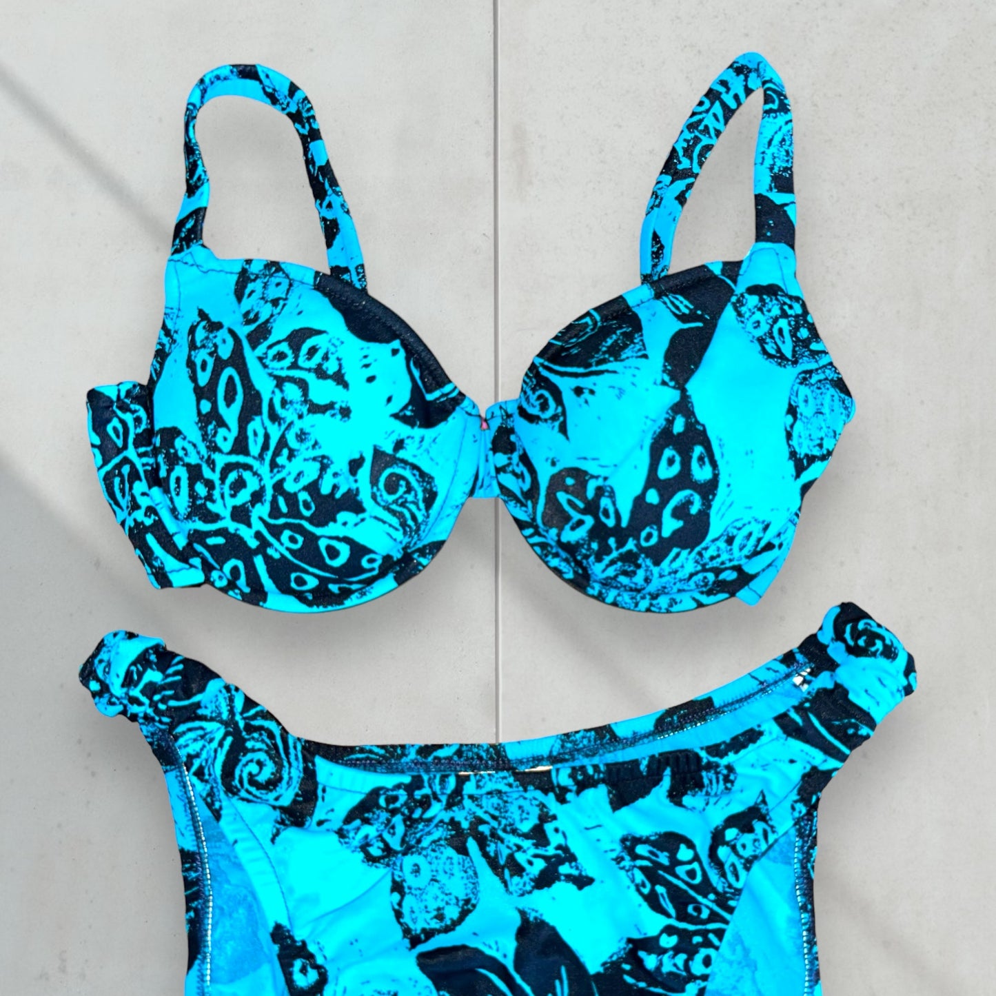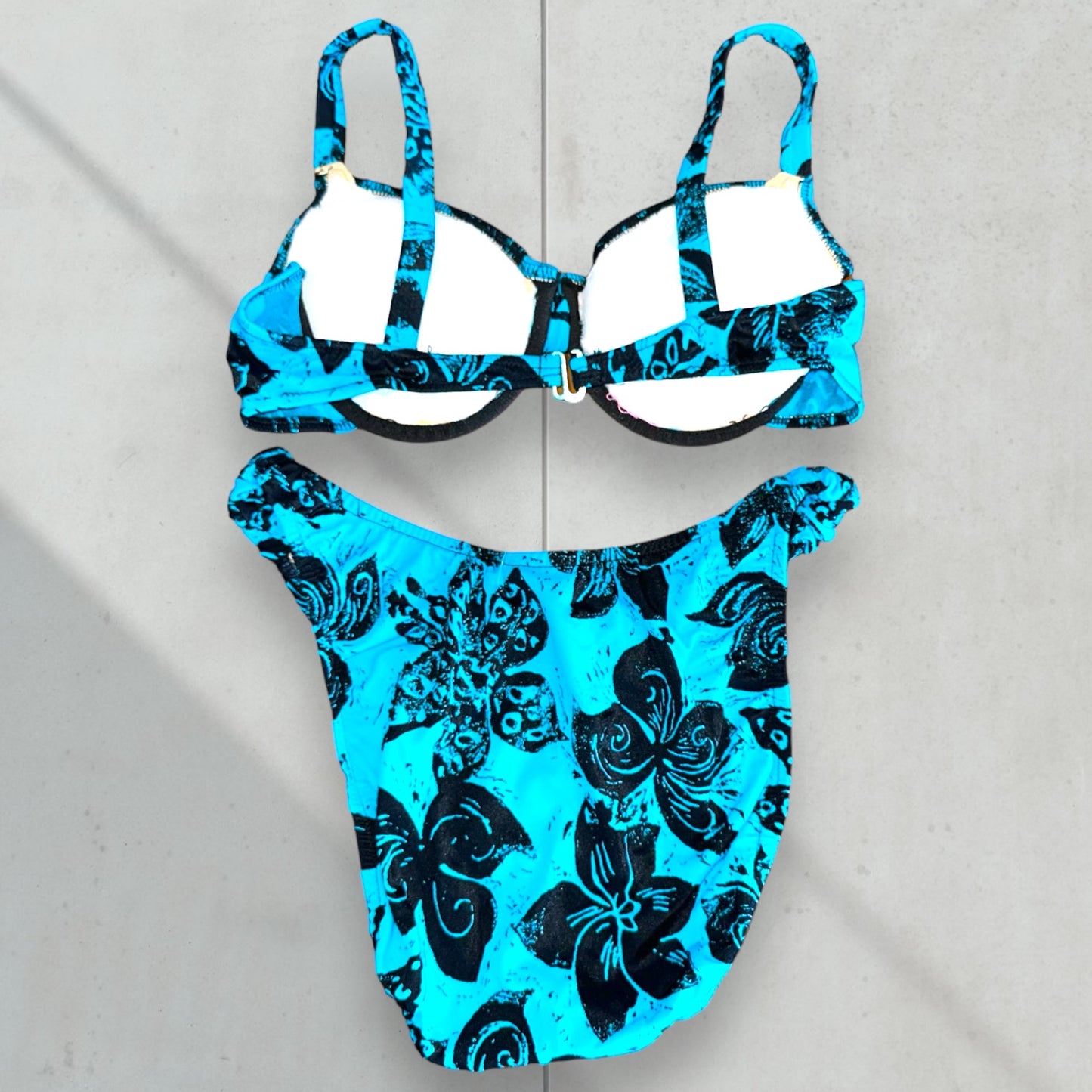 1990's deadstock vintage high quality, ultra soft, stretchy aqua blue with black abstract boho patterned, high-leg, Brazilian cut cheeky coverage, underwire PUSH UP PADDED swimsuit matching bikini set. Scrunch-strap details. Exceptionally figure flattering.