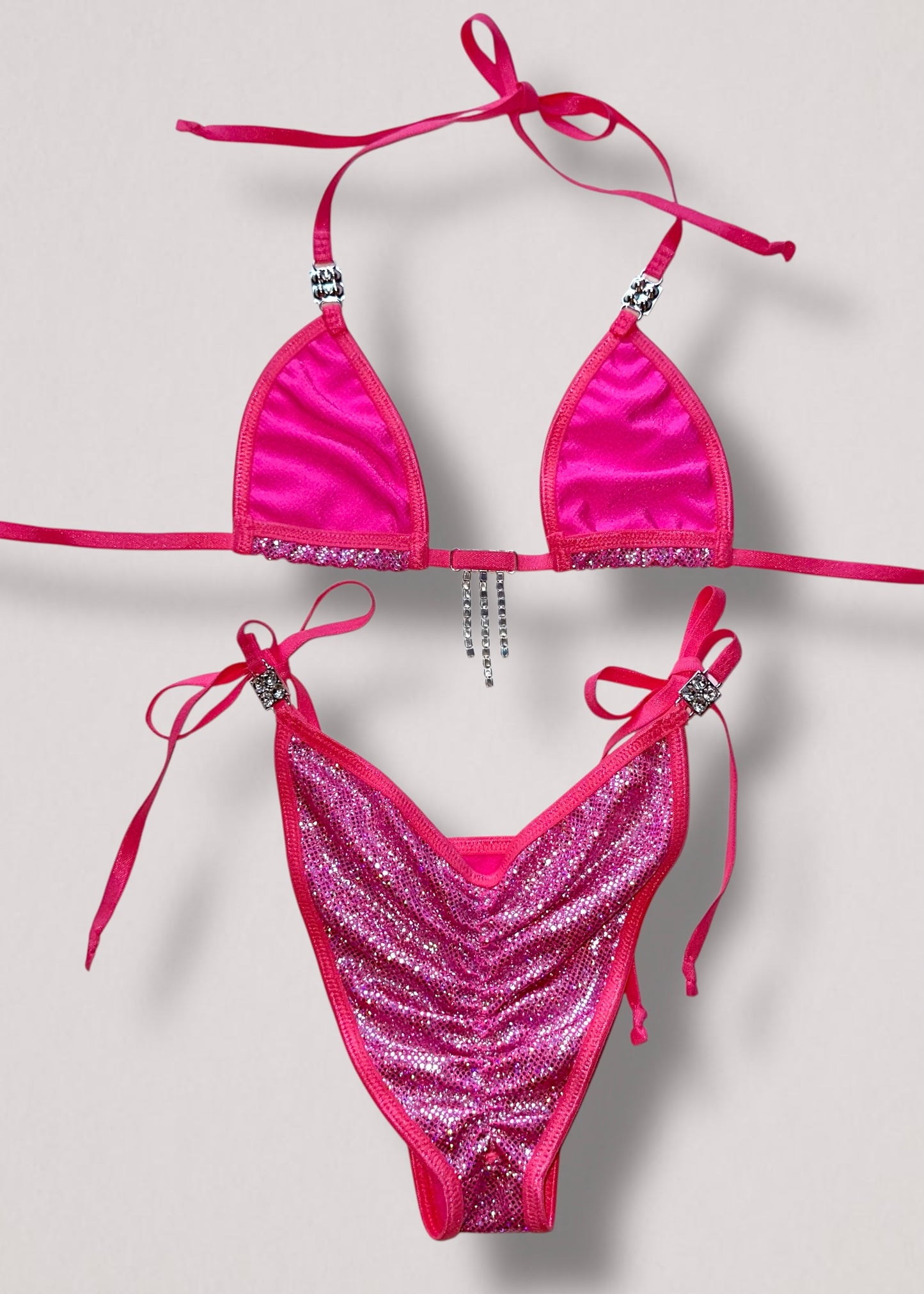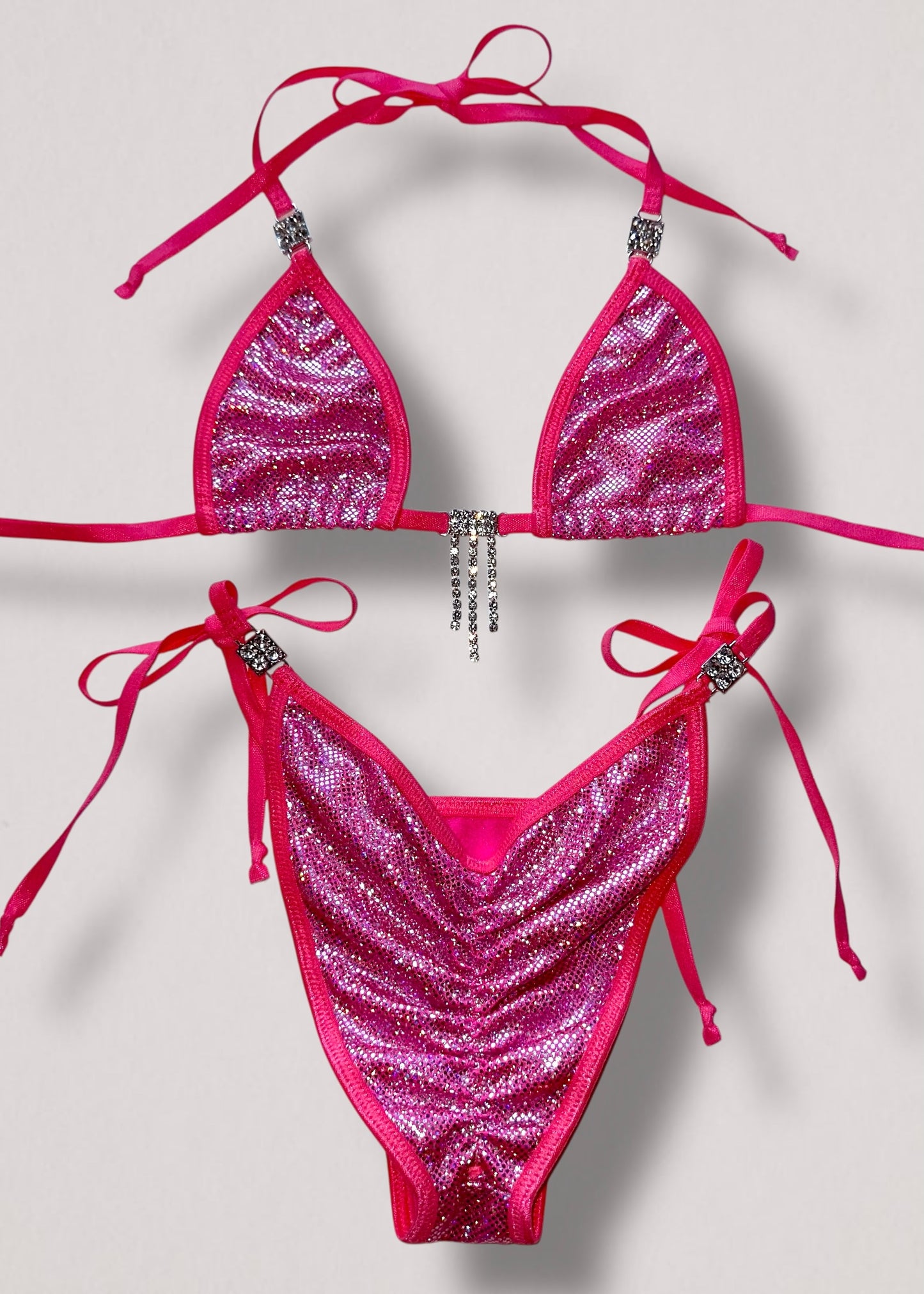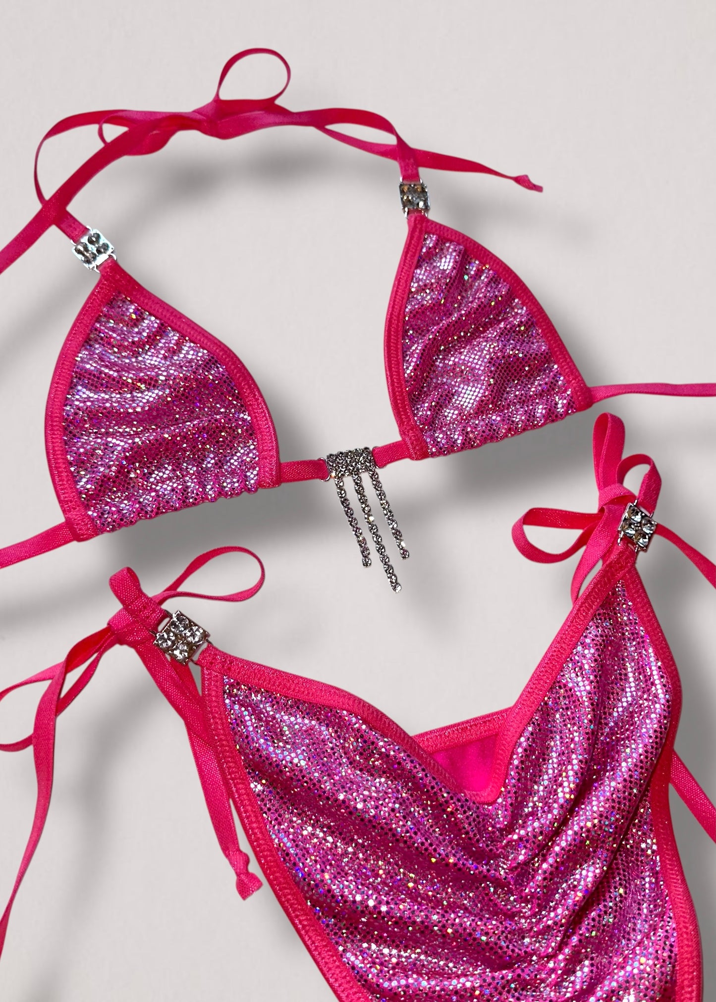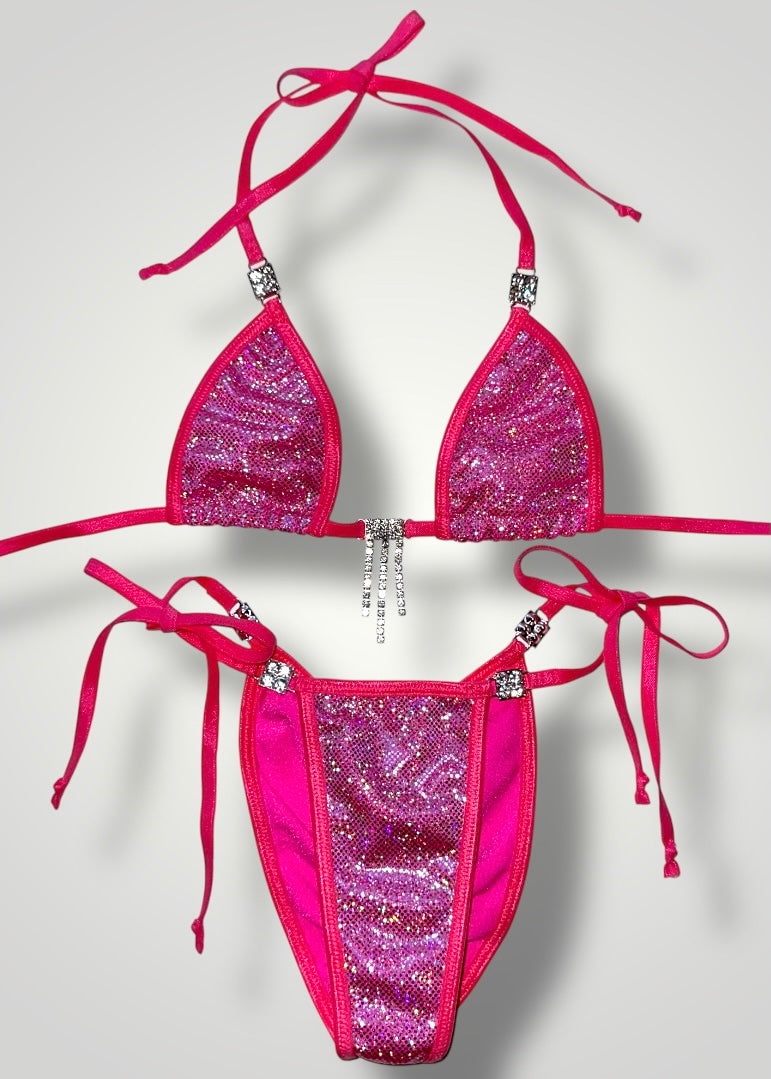 Turn heads with this rare, handmade pink holographic diamanté bikini set—an iconic early 2000s-inspired showstopper. The fully adjustable triangle halter top shimmers with hand-set silver-tone lariat drip diamanté stones, while the cheeky Brazilian scrunch-butt bottoms feature flirty tie-sides and a low-rise waist for the ultimate figure-flattering fit.