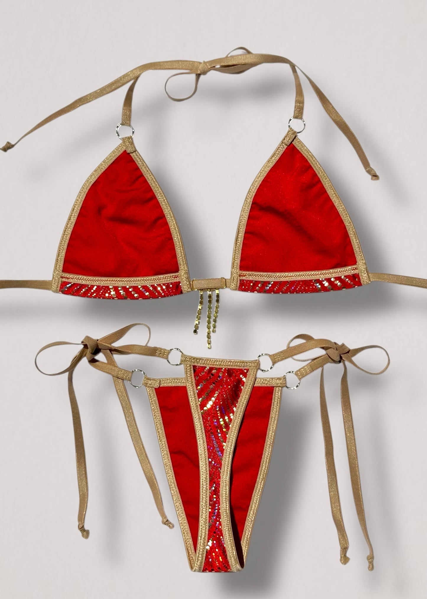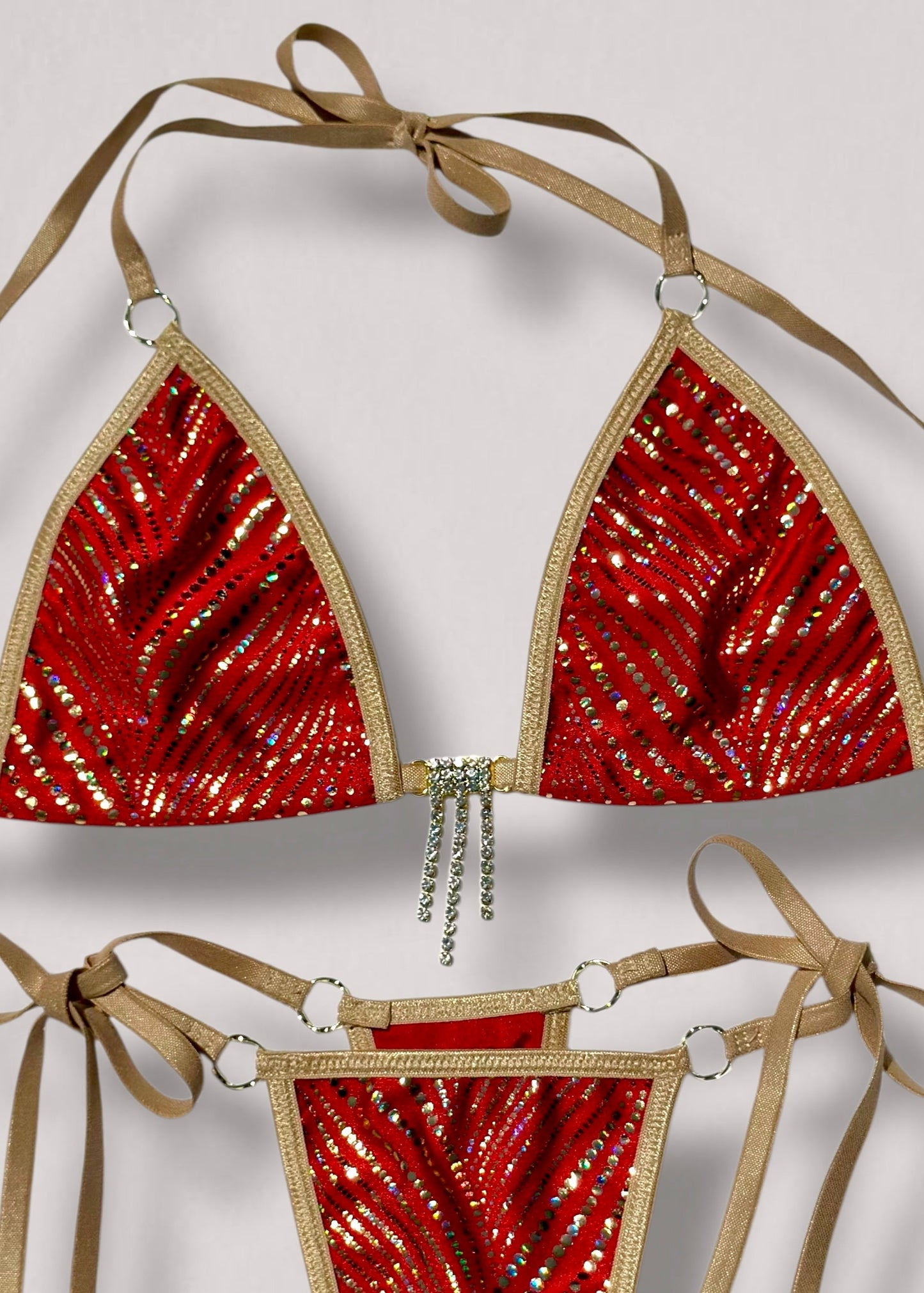 Turn heads in this ultra-sexy red-hot handmade Y2K rhinestone charm micro bikini set – a rare, luxe piece that’s made to steal the spotlight. The fully adjustable slide triangle halter top sparkles with dazzling diamanté embellishments, while the matching low-rise tie-side Brazilian thong features dainty O-ring hardware for that perfect retro touch.