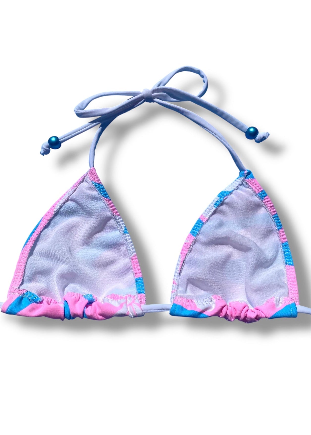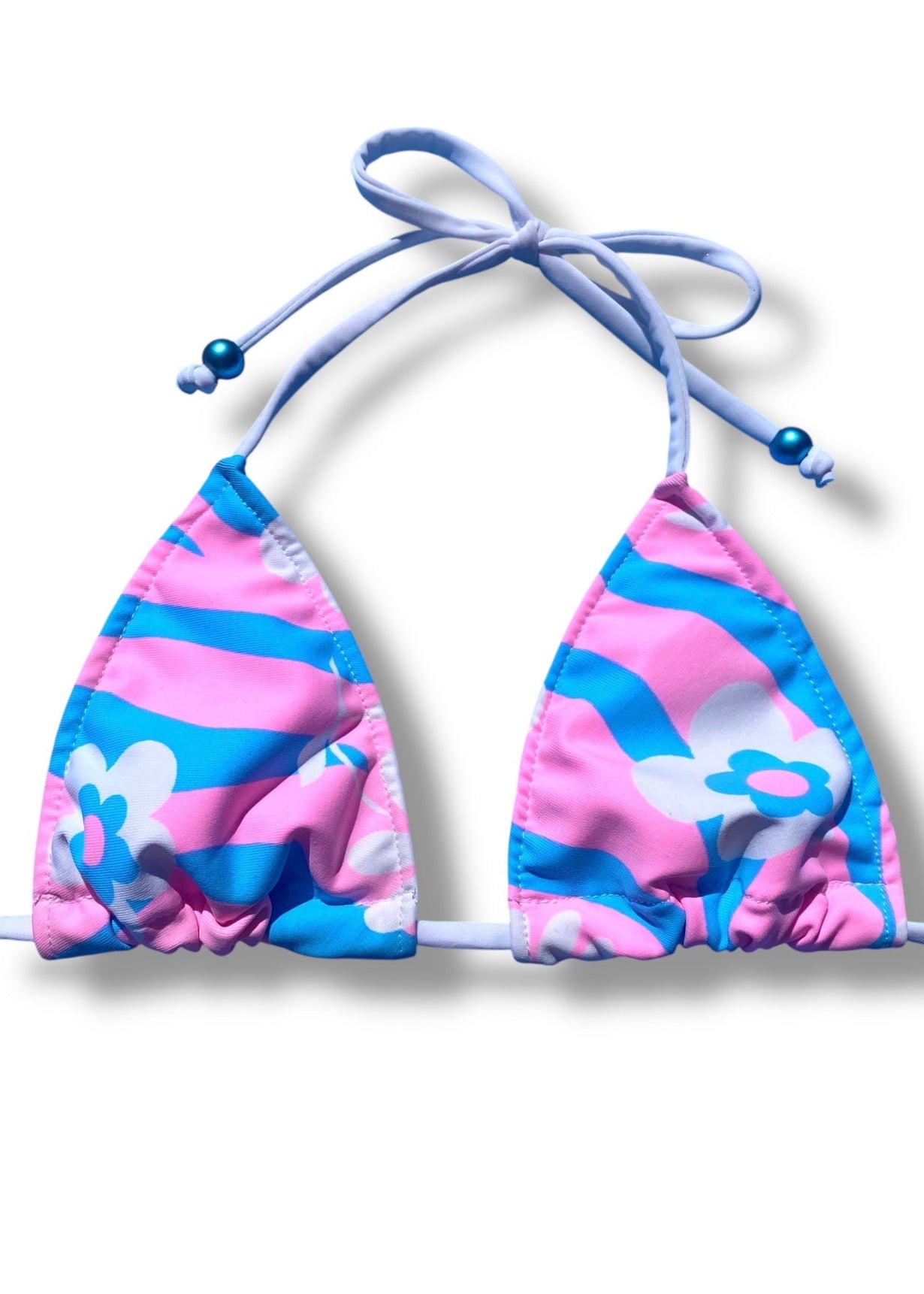 Float into full Y2K fantasy with the Denali Brand Psychedelic Floral Perfect Triangle Top — a skimpy, fully adjustable slide-triangle bikini top crafted from extremely rare, authentic early-1990s deadstock fabric. This ultra-stretchy pastel hot-pink material features a vibrant Psychedelic Floral print, hand-cut from non-placement vintage yardage — meaning every top is 100% unique.