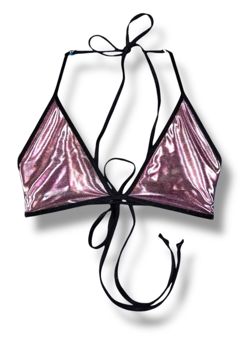 A retro-inspired, fixed-triangle halter designed to be as effortlessly hot and universally flattering as humanly possible. This is an ultra-rare late-90s/early-Y2K DEADSTOCK vintage ringer bikini top — made from holographic metallic swimsuit fabric with a silver oil-spill shimmer that catches the light with every move.