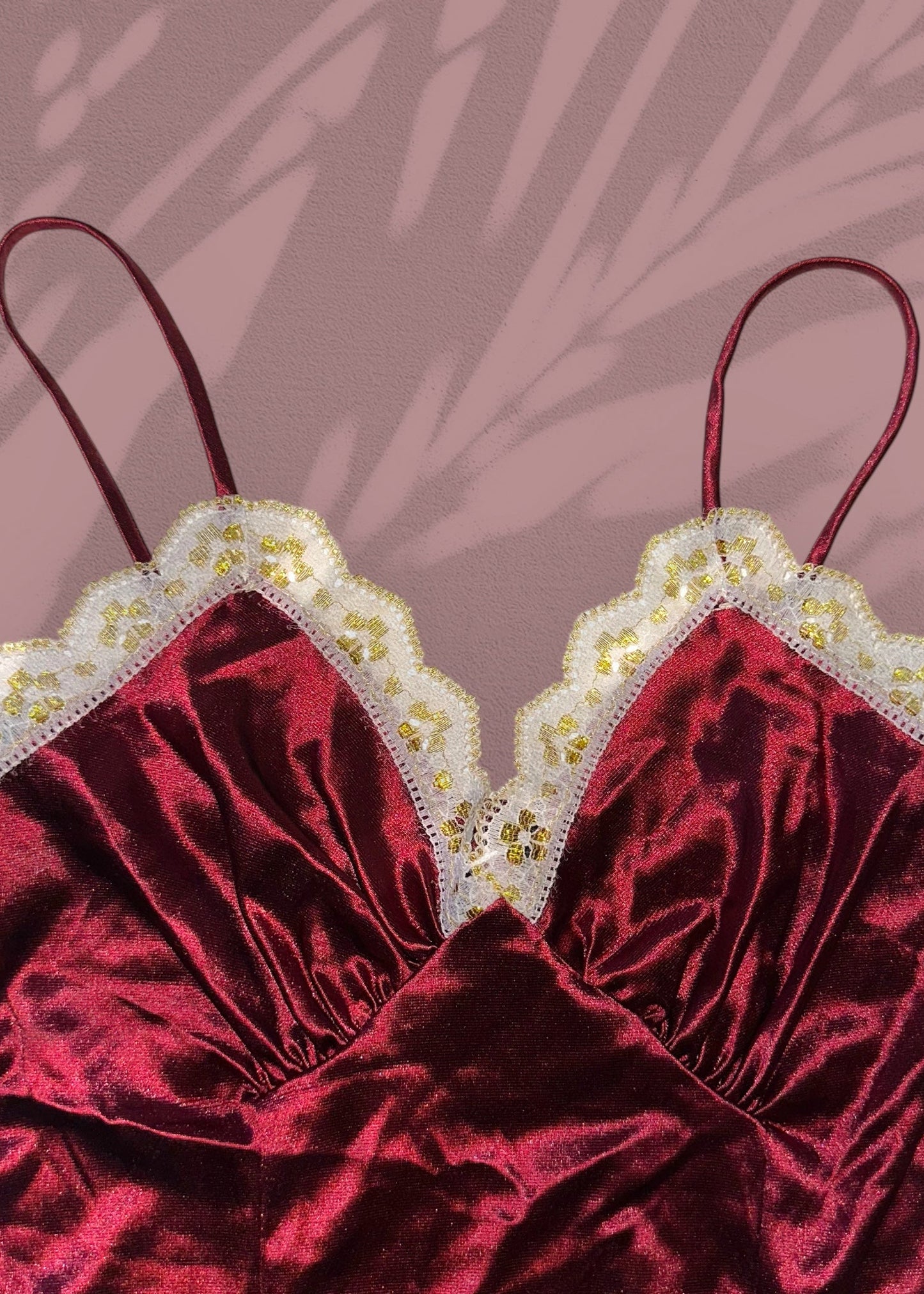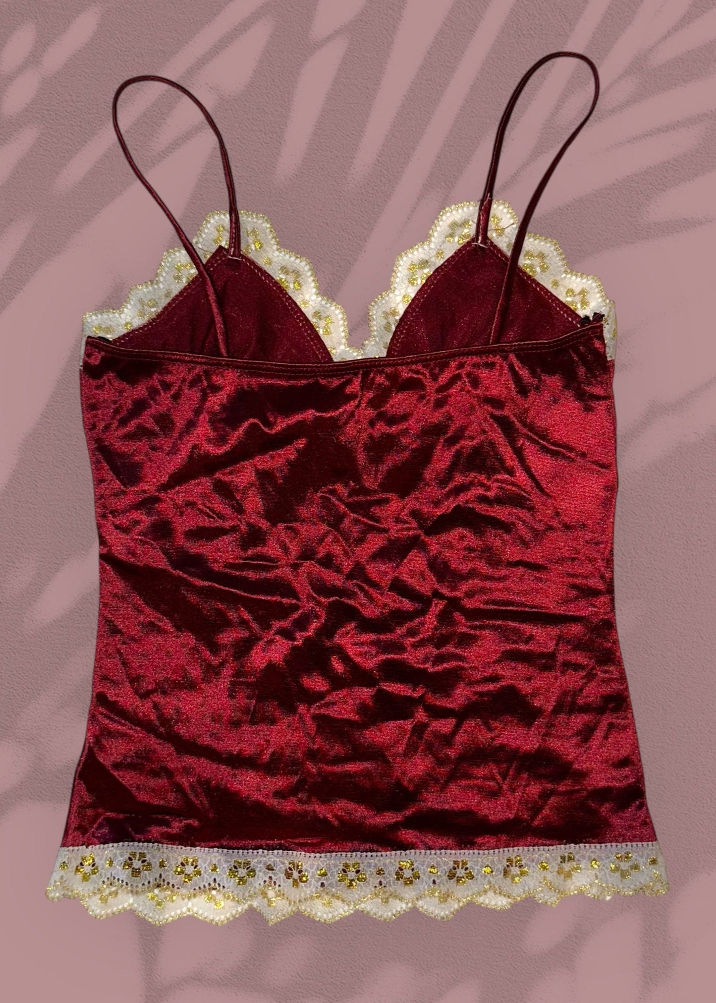 Y2K Burgundy Shimmer Lace Trim Cami Top – USA-Made Deadstock Vintage