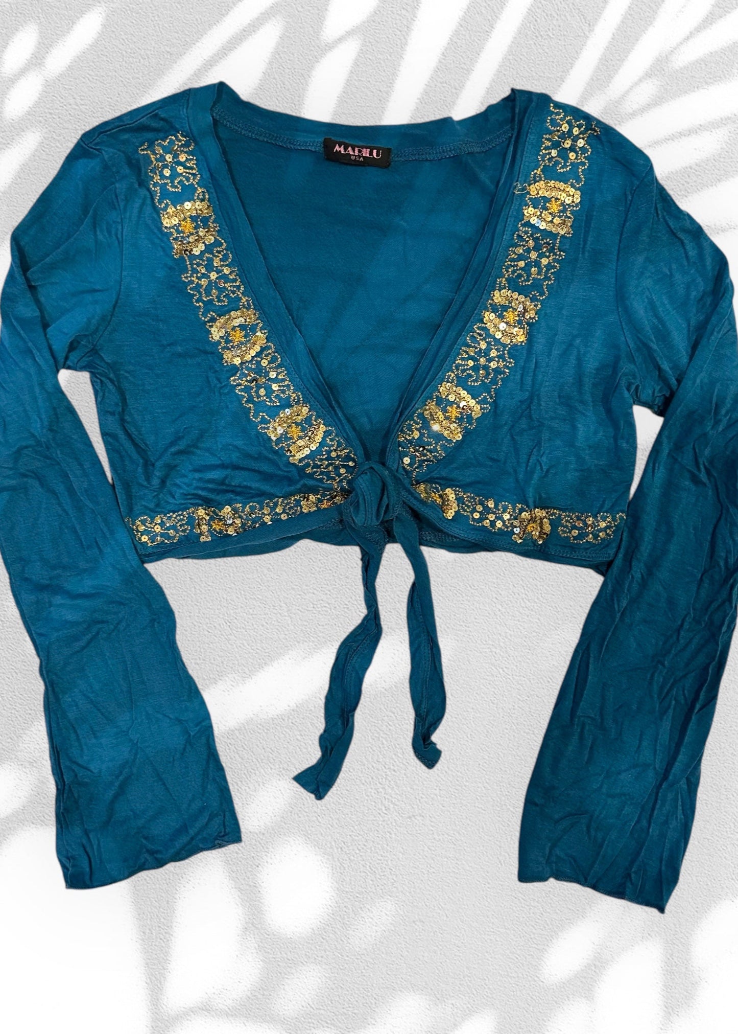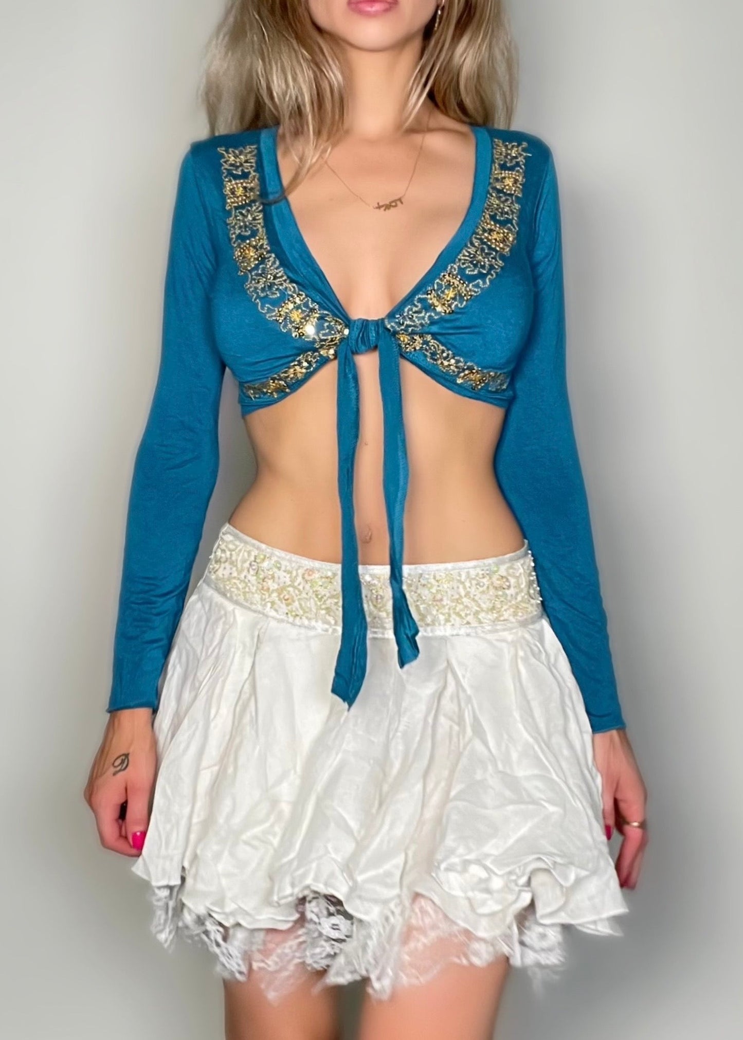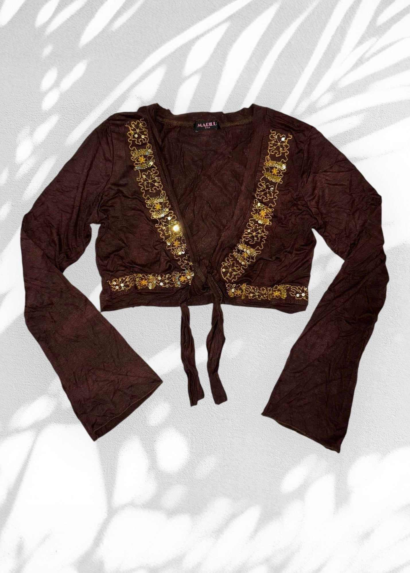 Y2K Bell Sleeve Bolero Crop Top | Gold Embellished Tie-Front Cardigan | Vintage Deadstock USA Made