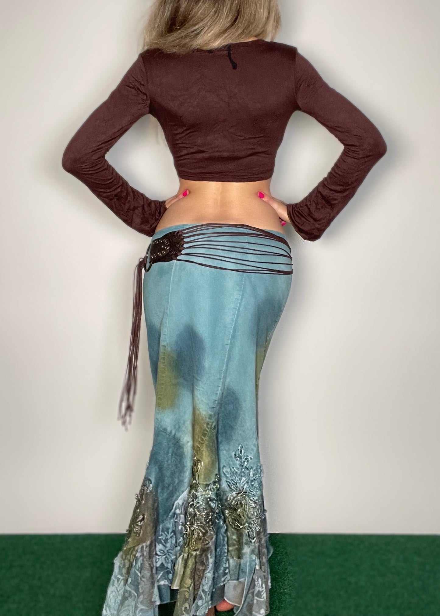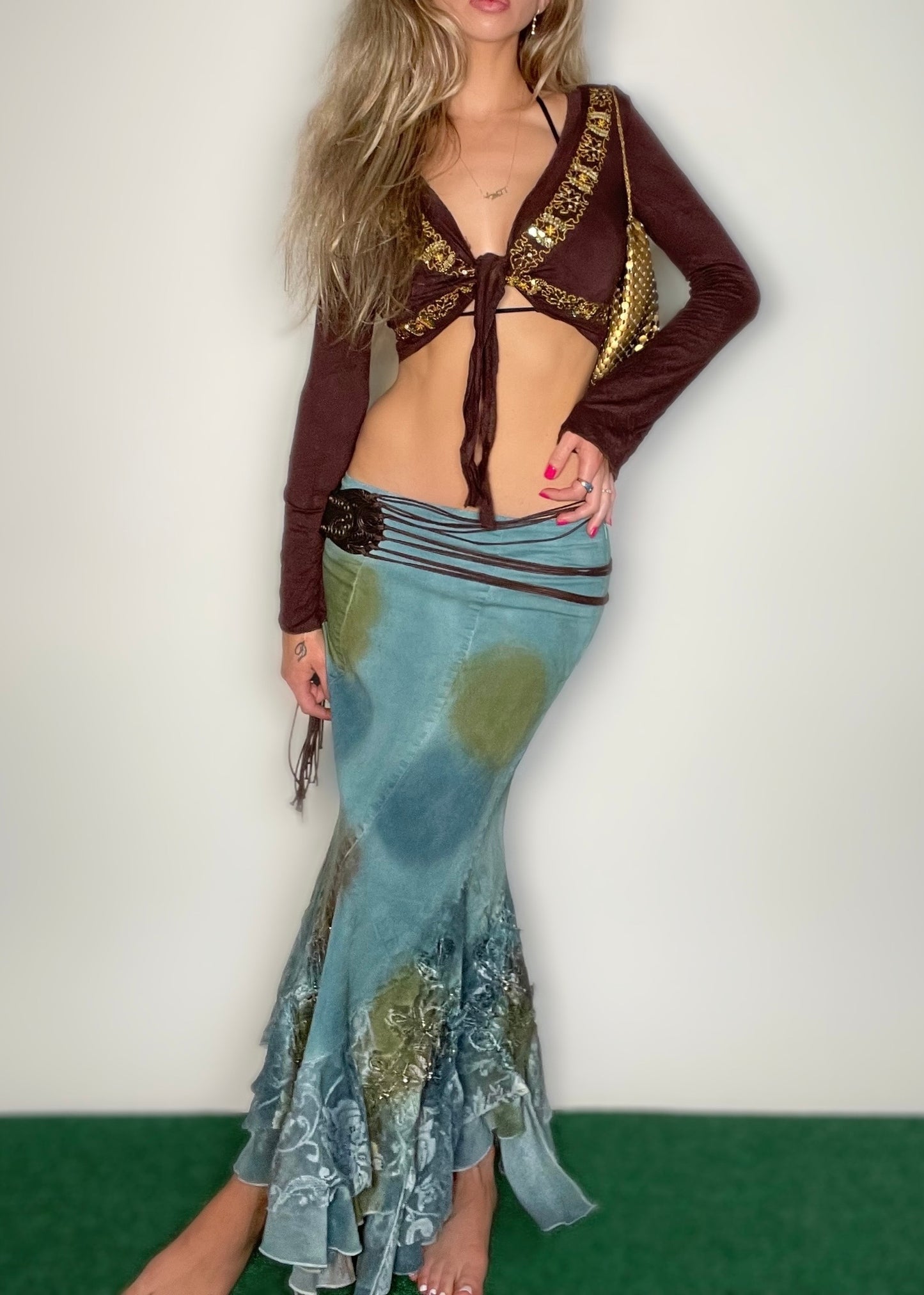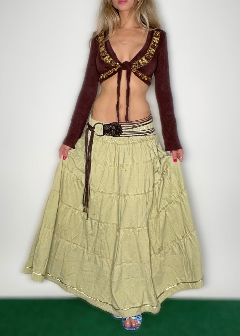 Y2K Bell Sleeve Bolero Crop Top | Gold Embellished Tie-Front Cardigan | Vintage Deadstock USA Made