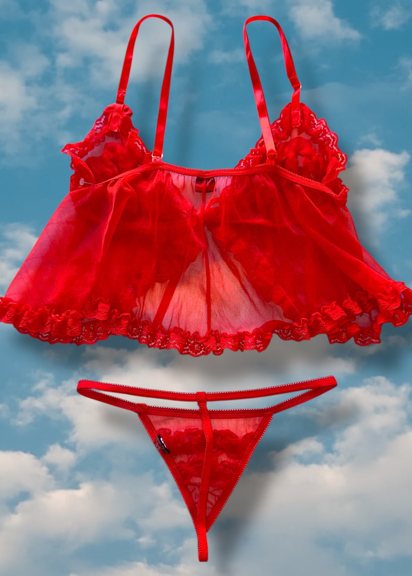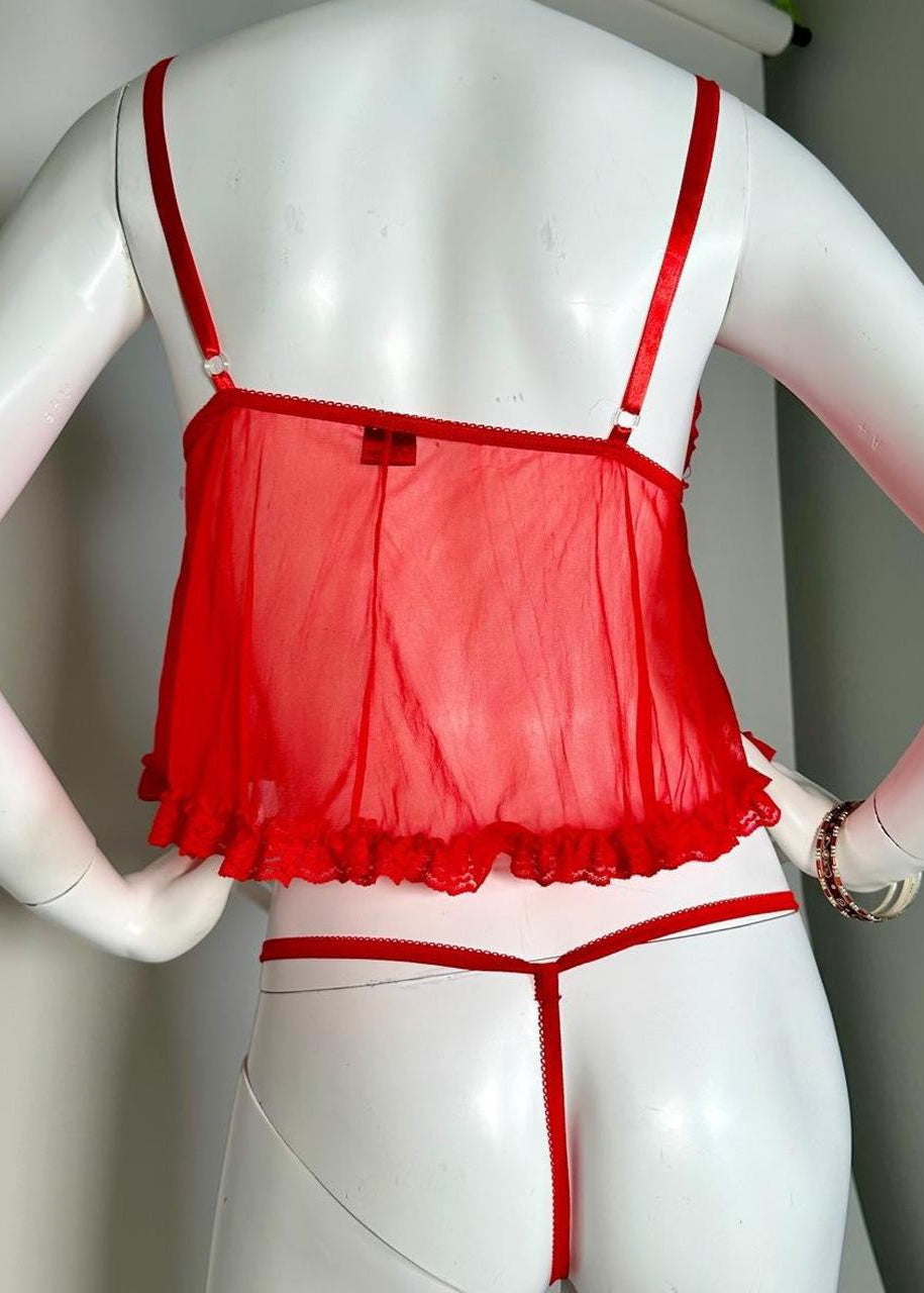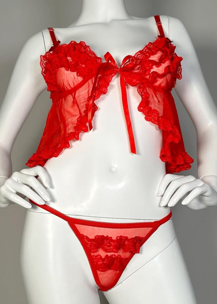 90s Red Babydoll Tie-Front Cami Top, Matching Ruffle-Lace Sheer Panty | Valentines Lingerie Set