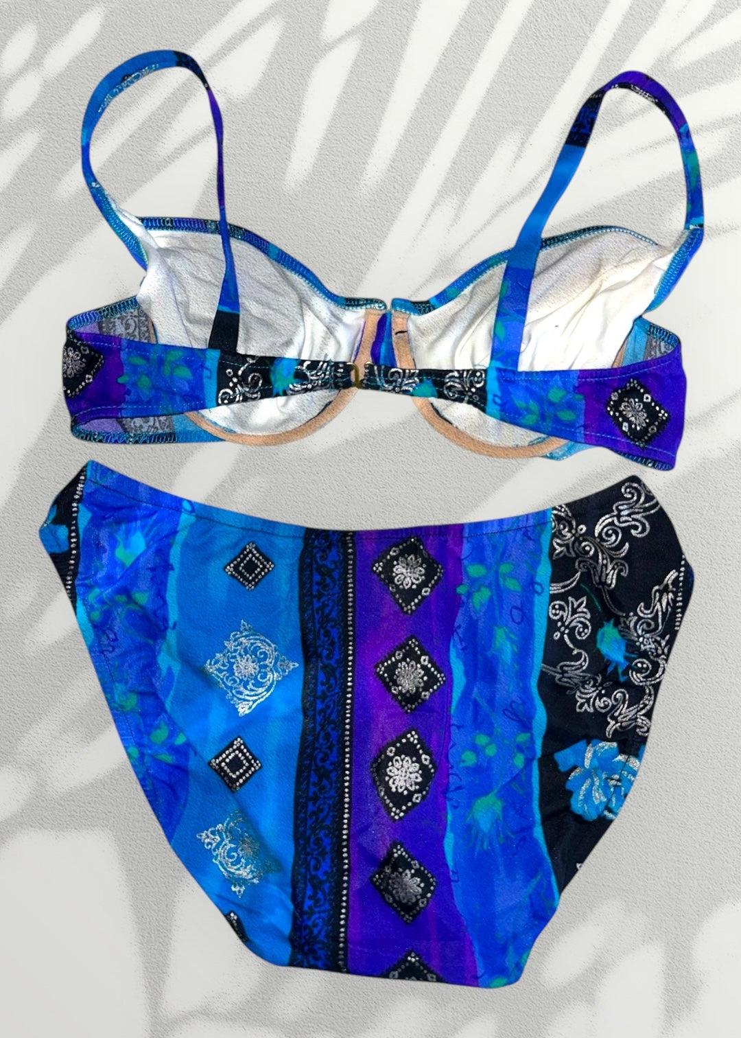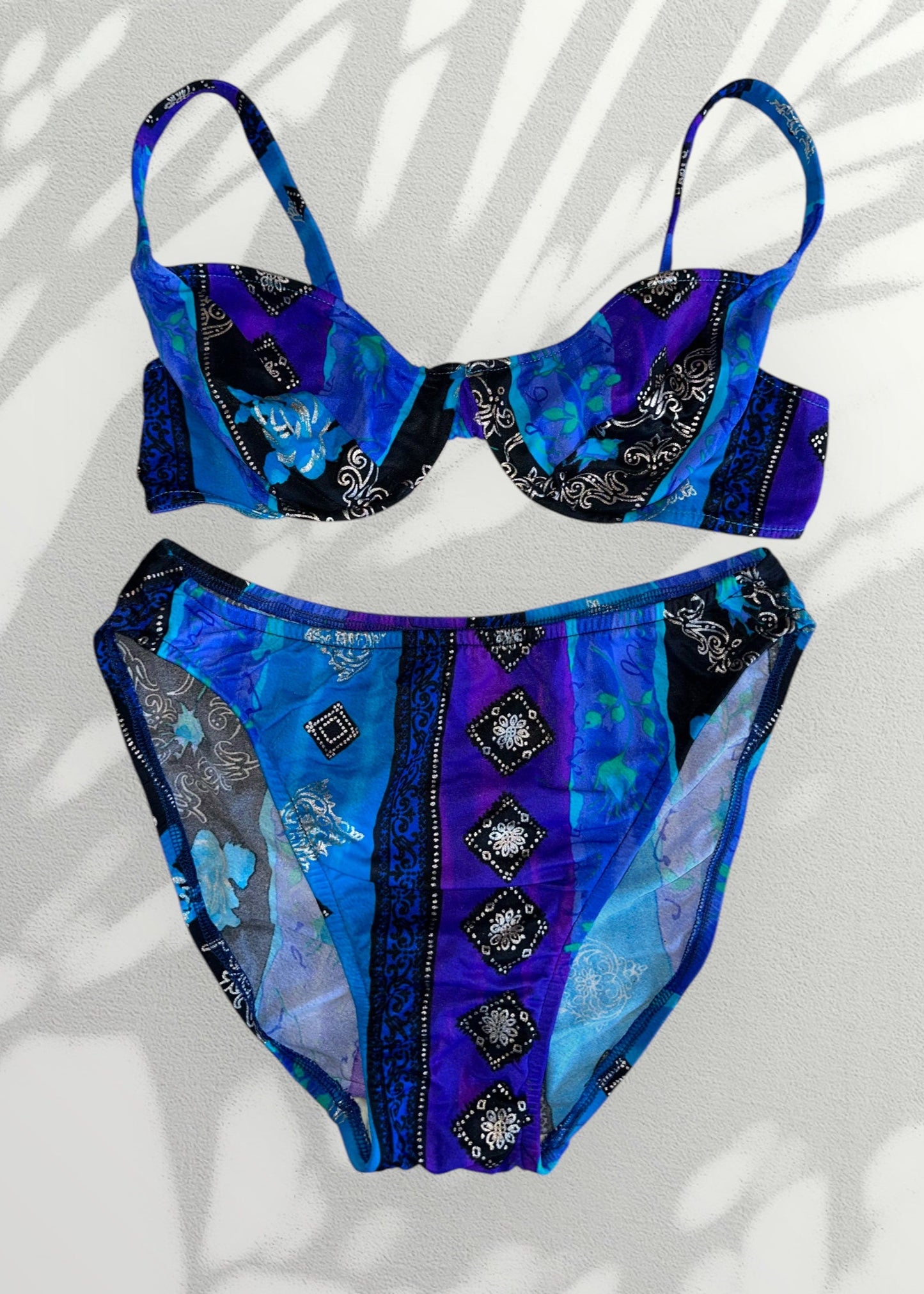 90's underwire double lined top and matching high waisted moderate coverage retro bikini bottom.