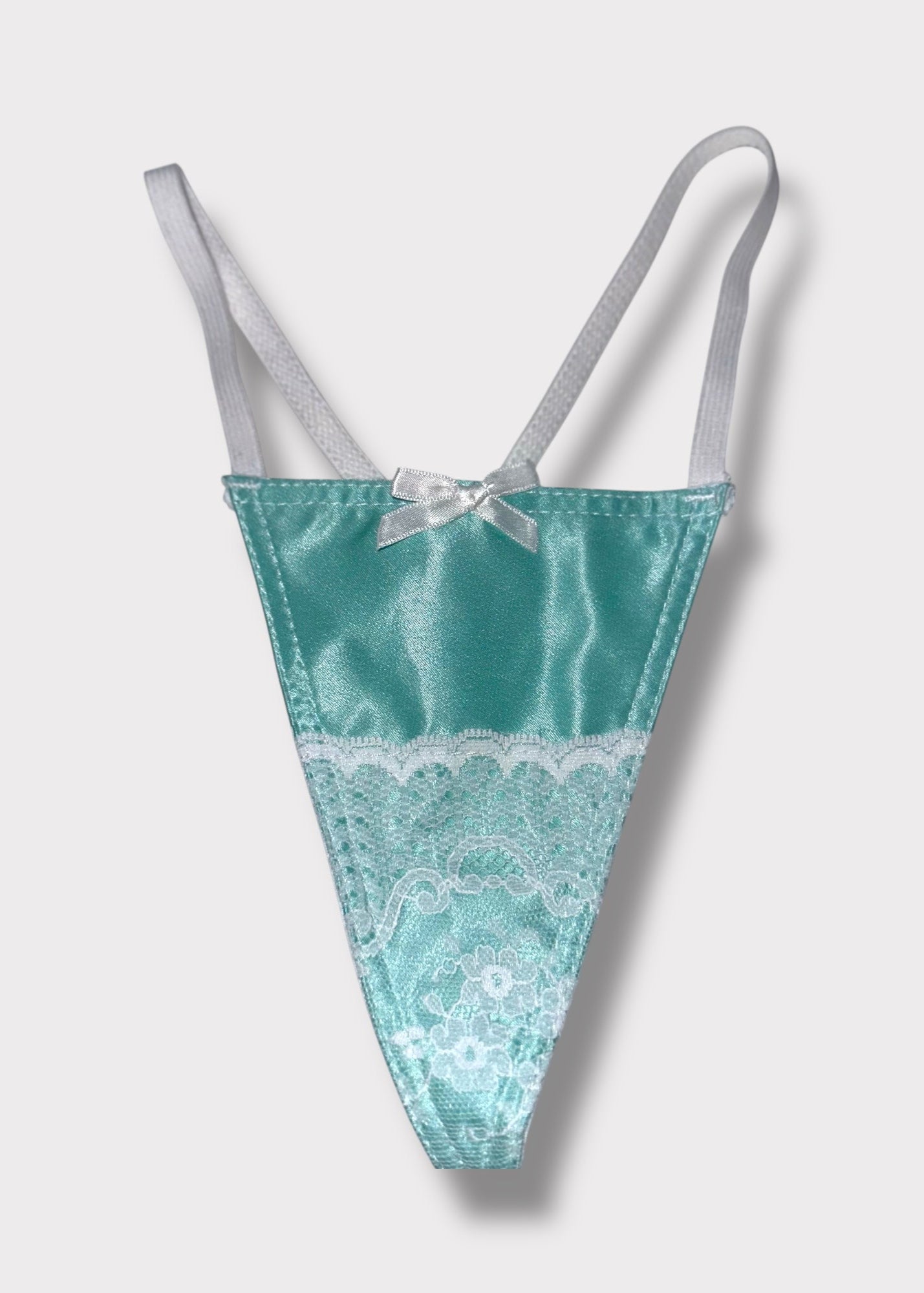 Slip into vintage luxury with this 90s High-Leg Satin Lace G-String Panty, a rare deadstock lingerie find that feels just as special as it looks. Crafted in soft satin with an embellished lace overlay in dreamy Tiffany blue and lilac tones, this thong is as romantic as it is sexy.