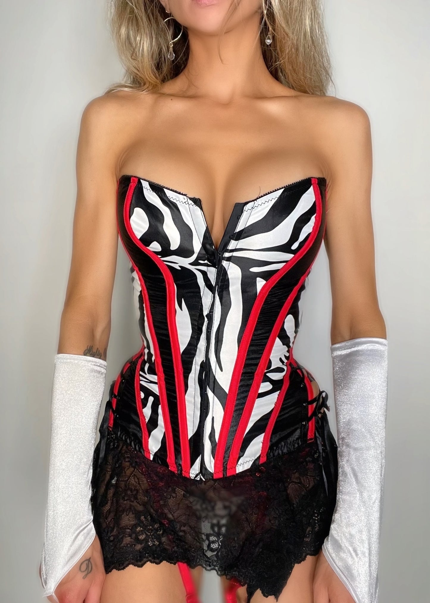 Turn heads in this ultra-rare 90s zebra-print corset top! Crafted from authentic late-1990s deadstock, it features a sultry sweetheart neckline, sculpting boning, and satin-spandex panels for a stunning hourglass shape. With a fully adjustable ribbon lace-up back, dramatic hip cutouts, and bold red trim, this corset perfects your waist and adds unforgettable style. Complete with a front hook closure, it pairs flawlessly with low-rise jeans and chunky platform boots for the ultimate retro look.