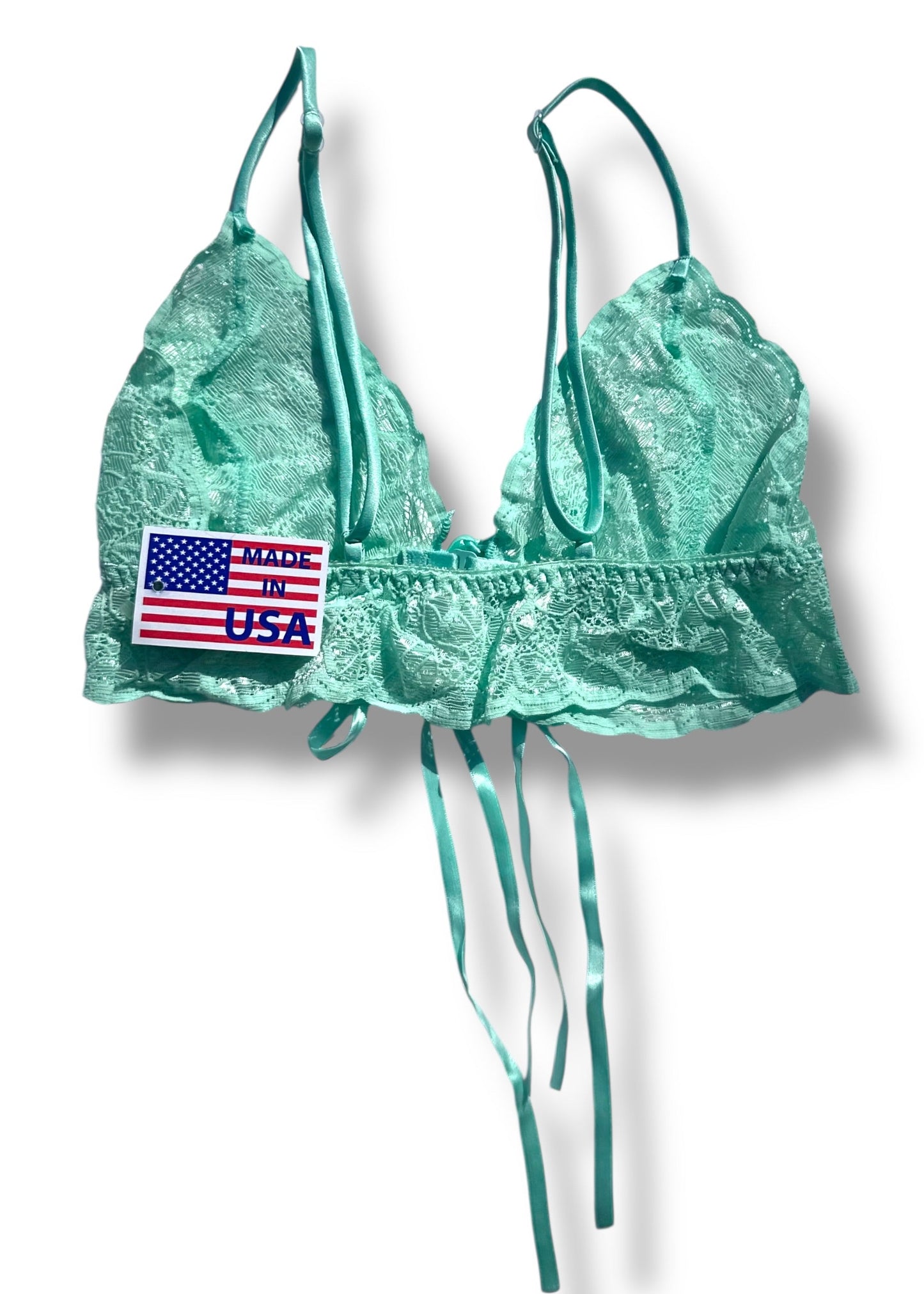 Authentic 1990s deadstock sheer lace bralette in unworn vintage condition with original tags. A true coquette lingerie staple featuring delicate floral lace, scalloped hem detailing, adjustable spaghetti straps, and a satin ribbon front-tie closure.