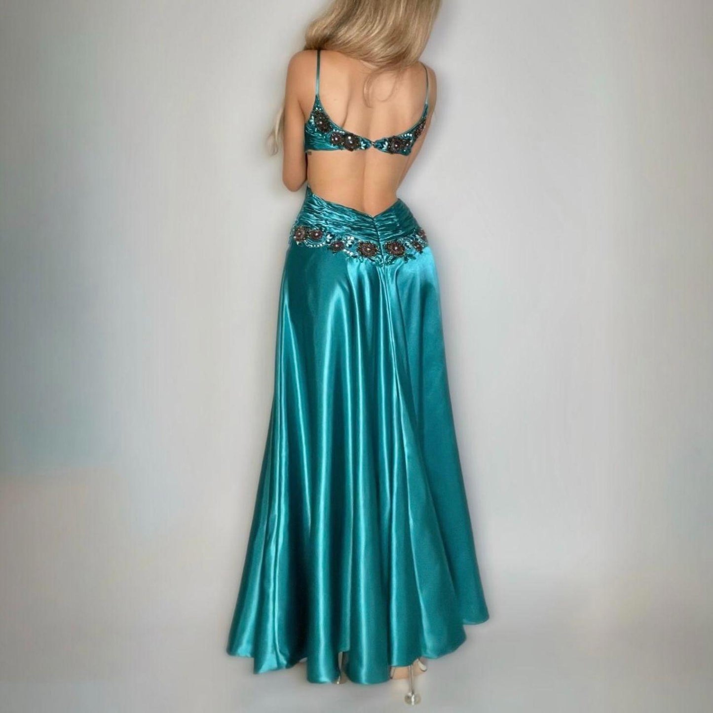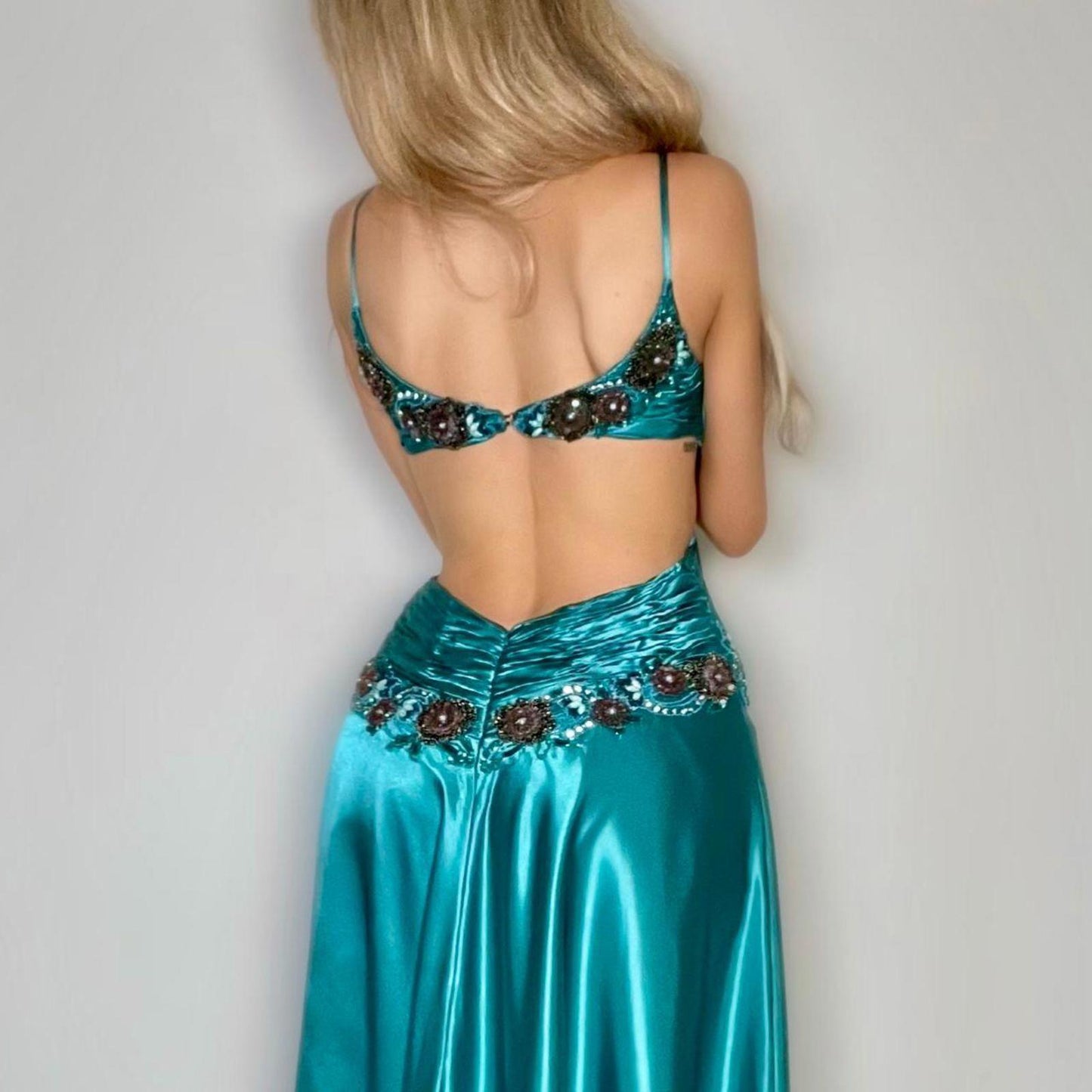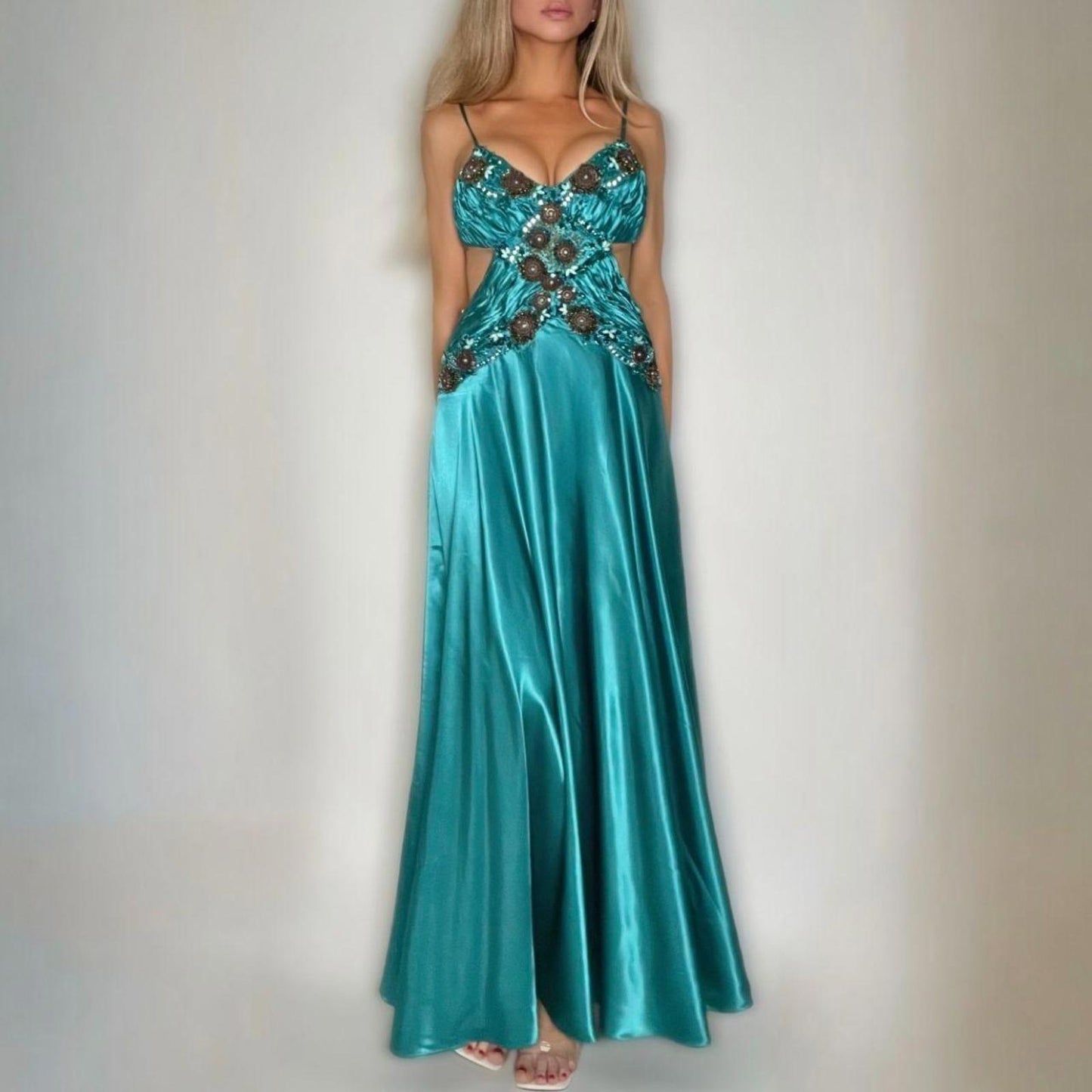 Y2K Bicici Backless Satin Gown – Blue Copper | Hand-Beaded Vintage Maxi (Size Small)