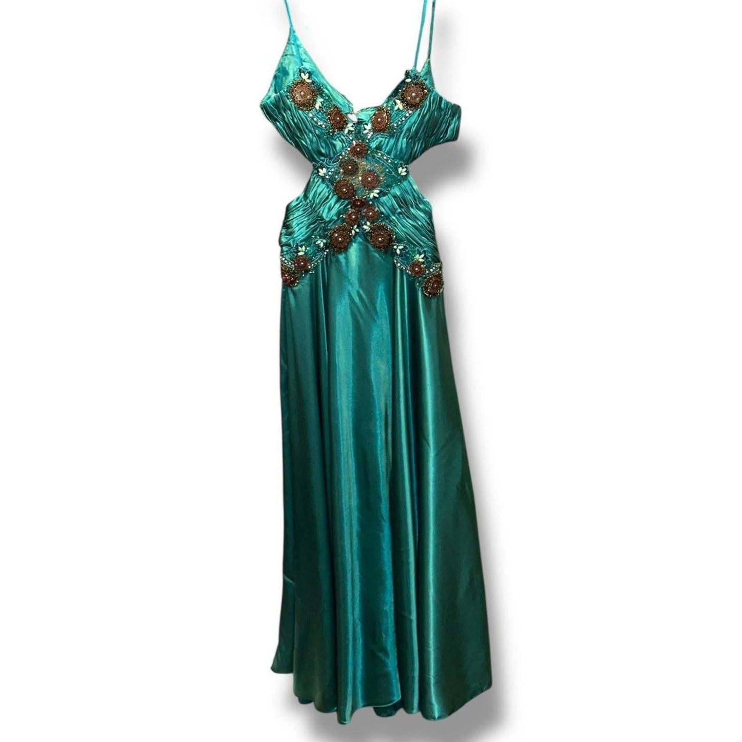 Step into pure Y2K goddess glamour with this authentic early-2000s Bicici satin evening gown, drenched in luminous blue-copper satin and adorned with hand-beaded brass floral appliqués throughout the bodice and waist. This piece is a true vintage statement — sensual, sculpted, and undeniably rare.