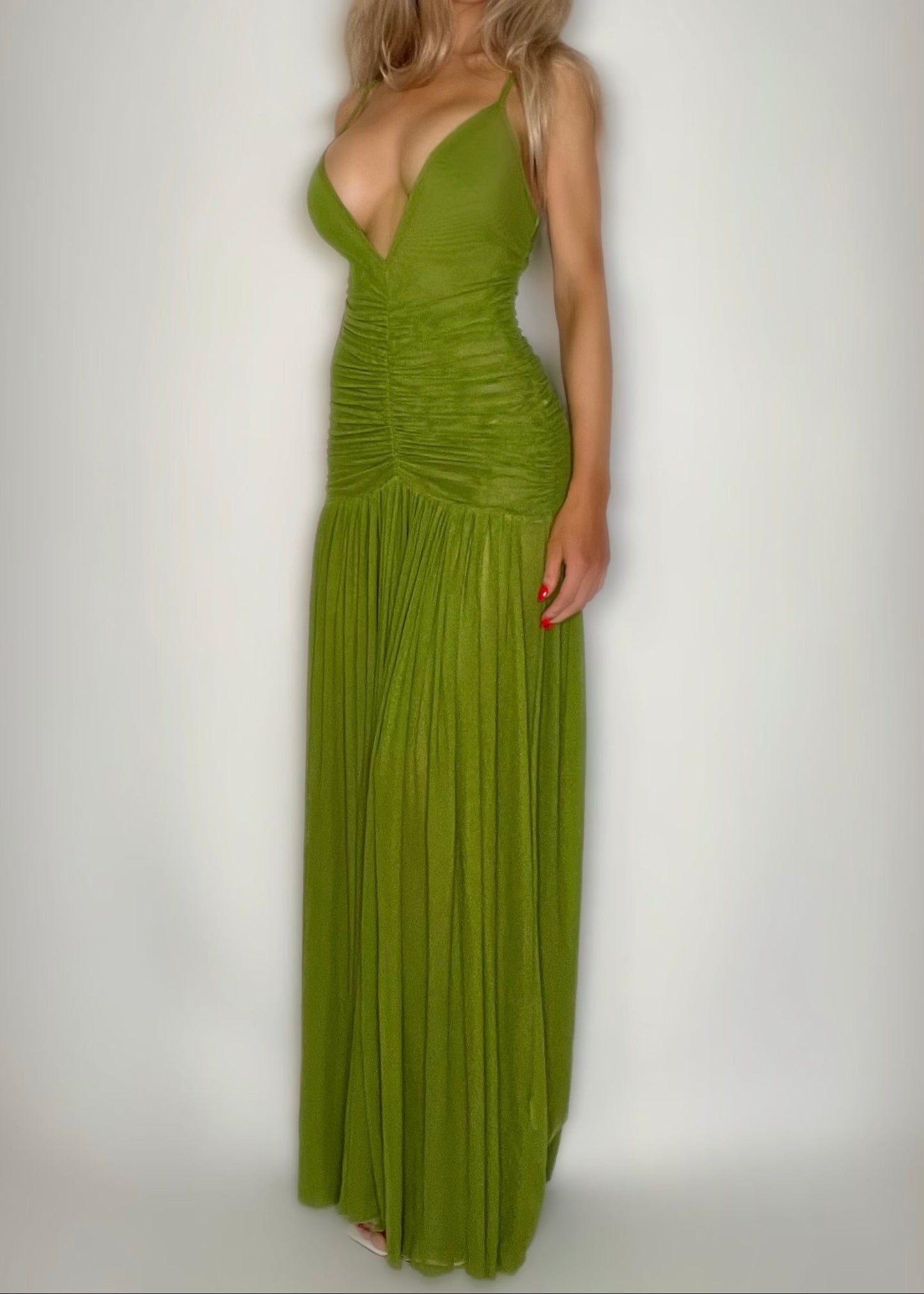Y2K Plunge Sheer Ruched Gown – Small | Vintage Green Maxi Dress